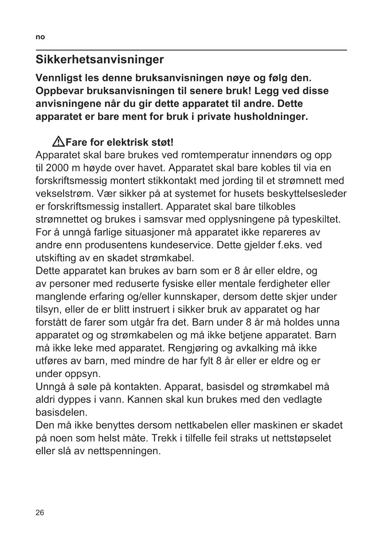 Sikkerhetsanvisninger Vennligst les denne bruksanvisningen nøye og følg den. Oppbevar bruksanvisningen til senere bruk! Legg ved disse anvisningene når du gir dette apparatet til andre. Dette apparatet er bare ment for bruk i private husholdninger. WFare for elektrisk støt! Apparatet skal bare brukes ved romtemperatur innendørs og opp til 2000 m høyde over havet. Apparatet skal bare kobles til via en forskriftsmessig montert stikkontakt med jording til et strømnett med vekselstrøm. Vær sikker på at systemet for husets beskyttelsesleder er forskriftsmessig installert. Apparatet skal bare tilkobles strømnettet og brukes i samsvar med opplysningene på typeskiltet. For å unngå farlige situasjoner må apparatet ikke repareres av andre enn produsentens kundeservice. Dette gjelder f.eks. ved utskifting av en skadet strømkabel. Dette apparatet kan brukes av barn som er 8 år eller eldre, og av personer med reduserte fysiske eller mentale ferdigheter eller manglende erfaring og/eller kunnskaper, dersom dette skjer under tilsyn, eller de er blitt instruert i sikker bruk av apparatet og har forstått de farer som utgår fra det. Barn under 8 år må holdes unna apparatet og og strømkabelen og må ikke betjene apparatet. Barn må ikke leke med apparatet. Rengjøring og avkalking må ikke utføres av barn, med mindre de har fylt 8 år eller er eldre og er under oppsyn. Unngå å søle på kontakten. Apparat, basisdel og strømkabel må aldri dyppes i vann. Kannen skal kun brukes med den vedlagte basisdelen. Den må ikke benyttes dersom nettkabelen eller maskinen er skadet på noen som helst måte. Trekk i tilfelle feil straks ut nettstøpselet eller slå av nettspenningen.27