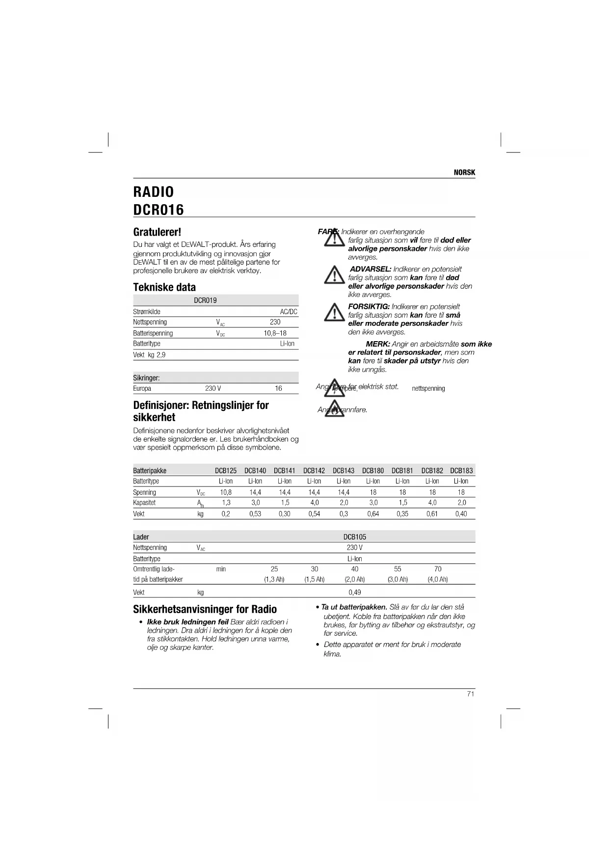 - Het product in redelijke mate is versleten;71 NORSK RADIO DCR016 FARE: Indikerer en overhengende farlig situasjon som vil føre til død eller alvorlige personskader hvis den ikke avverges. ADVARSEL: Indikerer en potensielt farlig situasjon som kan føre til død eller alvorlige personskader hvis den ikke avverges. FORSIKTIG: Indikerer en potensielt farlig situasjon som kan føre til små eller moderate personskader hvis den ikke avverges. MERK: Angir en arbeidsmåte som ikke er relatert til personskader, men som kan føre til skader på utstyr hvis den ikke unngås. Angir fare for elektrisk støt. Angir brannfare. Gratulerer! Du har valgt et DEWALT-produkt. Års erfaring gjennom produktutvikling og innovasjon gjør DEWALT til en av de mest pålitelige partene for profesjonelle brukere av elektrisk verktøy. Tekniske data DCR019 Strømkilde AC/DC Nettspenning V