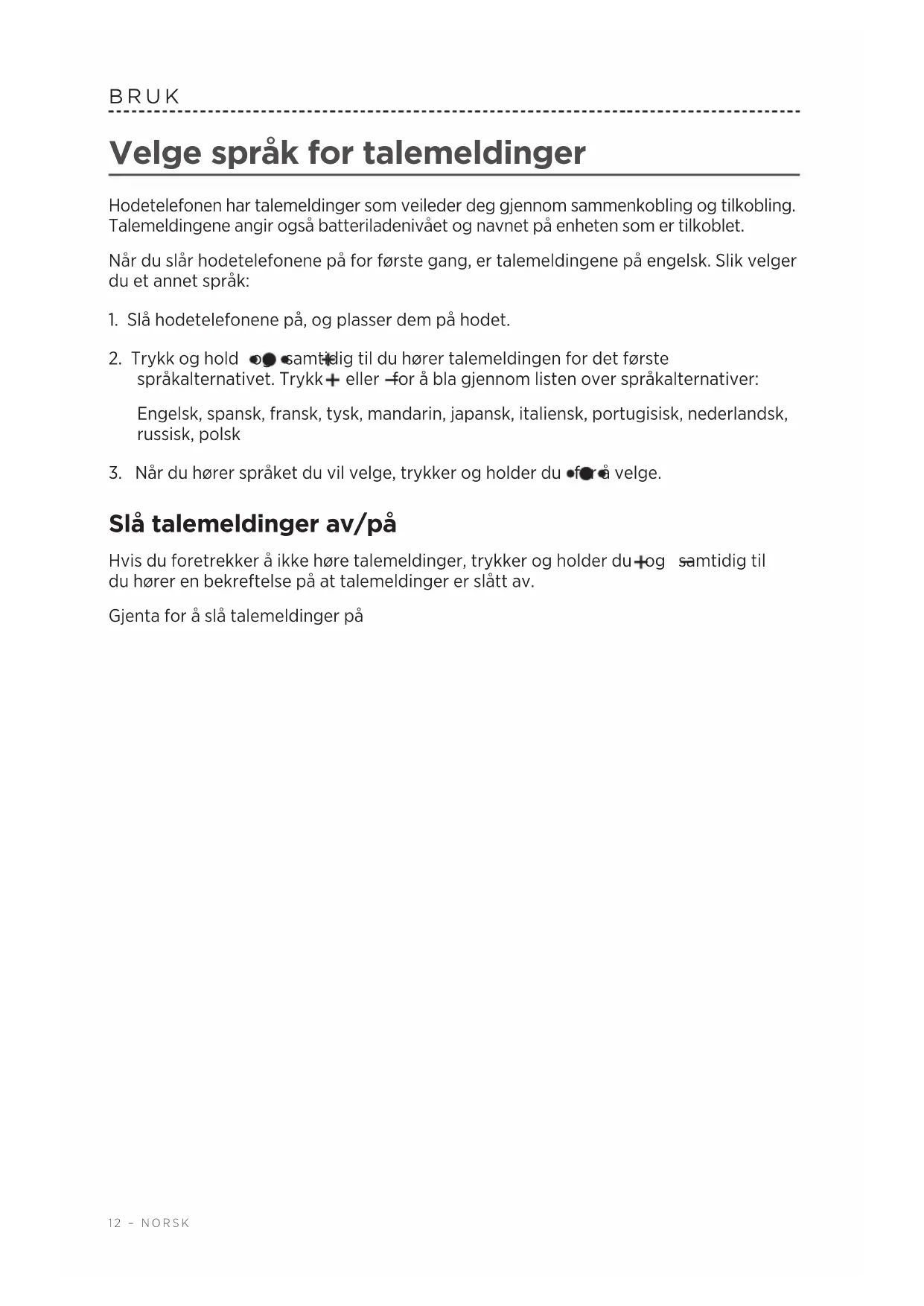 La det gå opptil tre timer for fullstendig opplading av batteriet. En fullstendig lading vil drive hodetelefonene i opptil 15 timer. En kort lading på 15 minutter er nok til å bruke hodetelefonene i opptil 2 timer. Merk: Hodetelefonene kan ikke brukes til lytting mens de lader. Batteriindikator Batteriindikatoren er plassert på høyre øreklokke. Når batteriet lades, lyser batteriindikatoren gult. Når batteriet er fulladet, lyser batteriindikatoren grønt. Merk: Når hodetelefonene er i bruk, blinker batteriindikatoren rødt når batteriet må lades. Se “Statusindikatorer for hodetelefonene” på side 17.12 – NORSK BRUK Velge språk for talemeldinger Hodetelefonen har talemeldinger som veileder deg gjennom sammenkobling og tilkobling. Talemeldingene angir også batteriladenivået og navnet på enheten som er tilkoblet. Når du slår hodetelefonene på for første gang, er talemeldingene på engelsk. Slik velger du et annet språk: