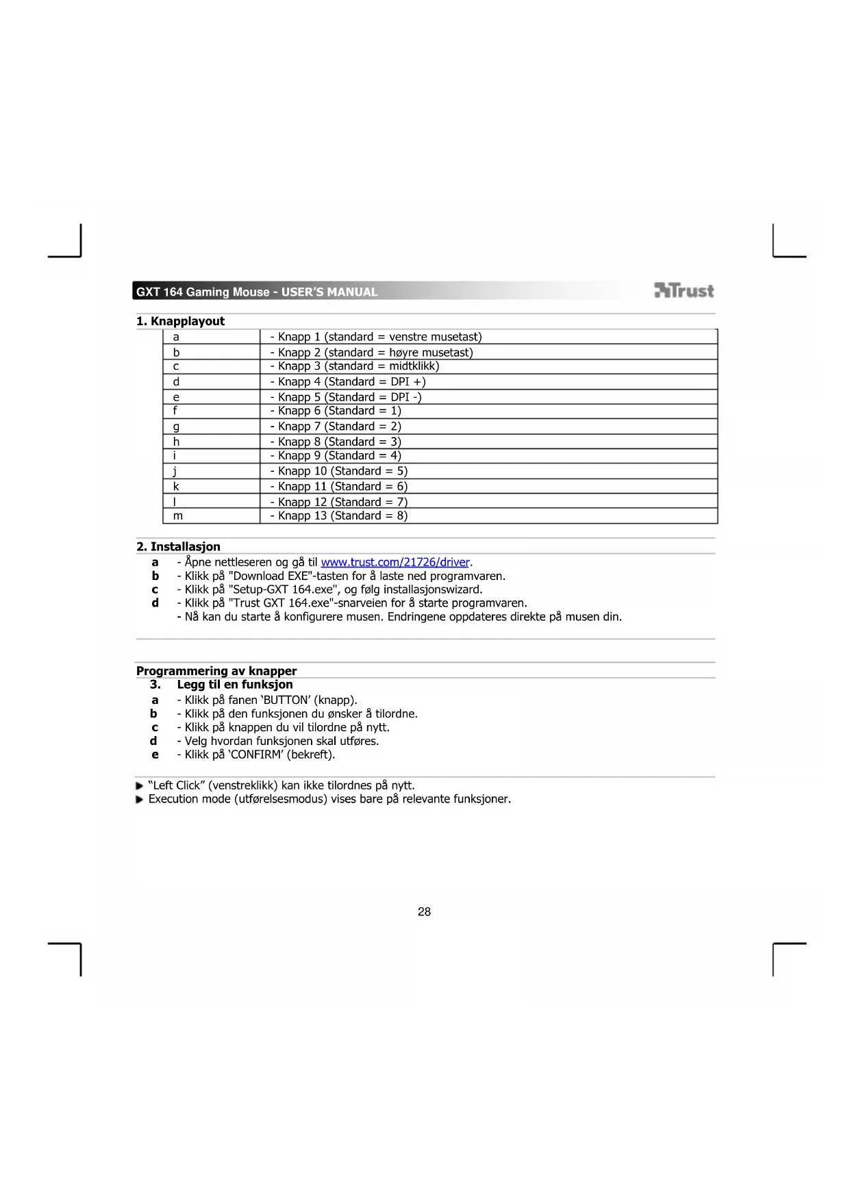 Legg til en funksjon - Klikk på fanen ‘BUTTON’ (knapp). - Klikk på den funksjonen du ønsker å tilordne. - Klikk på knappen du vil tilordne på nytt. - Velg hvordan funksjonen skal utføres. - Klikk på ‘CONFIRM’ (bekreft). “Left Click” (venstreklikk) kan ikke tilordnes på nytt. Execution mode (utførelsesmodus) vises bare på relevante funksjoner.GXT 164 Gaming Mouse - USER’S MANUAL