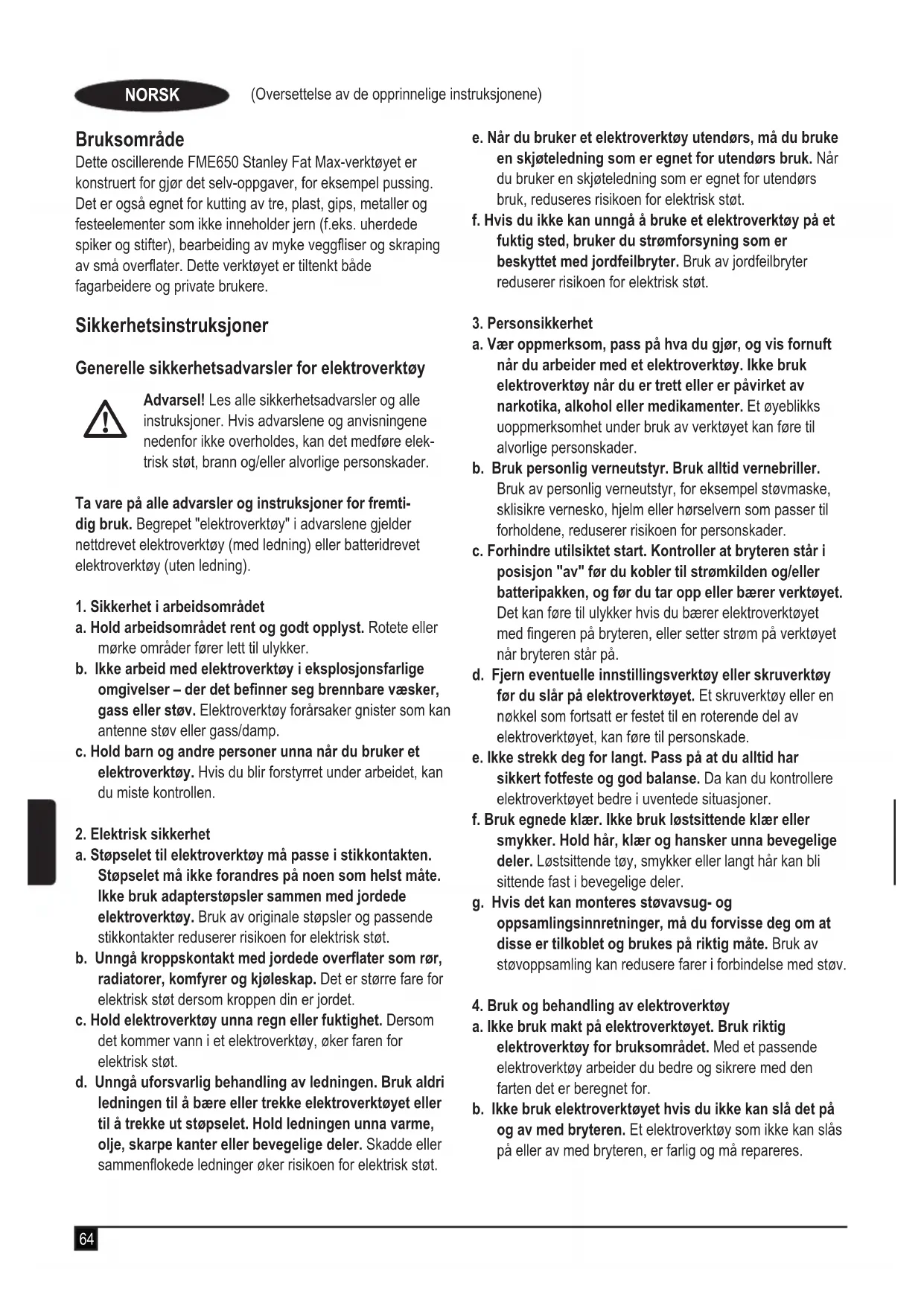 FME650 oscillerende verktøyet Stanley Europe erklærer at disse produktene som er beskre- vet under "Tekniske data", er i samsvar med: 2006/42/EF, EN60745-1:2009+A11:2010, EN60745-2-4:2009+A11:2011 Disse produktene er også i samsvar med direktiv 2014/30/ EU og 2011/65/EU. Hvis du ønsker mer informasjon, kontakt Stanley Europe på følgende adresse, eller se på baksiden av håndboken. Undertegnede er ansvarlig for utarbeidelsen av den tekniske dokumentasjonen og gir denne erklæringen på vegne av Stanley Europe. R. Laverick Engineering Director Stanley Europe, Egide Walschaertsstraat14-18, 2800 Mechelen, Belgia 06/12/201670 (Oversettelse av de opprinnelige instruksjonene) NORSK Garanti Stanley Europe er trygg på kvaliteten på sine produkter og tilbyr en enestående garanti til profesjonelle brukere av produktet. Denne garantierklæringen kommer i tillegg til og reduserer på ingen måte dine kontraktmessige rettigheter som privat ikke-profesjonell bruker. Garantien er gyldig i EU- og EFTA-medlemsstatene.