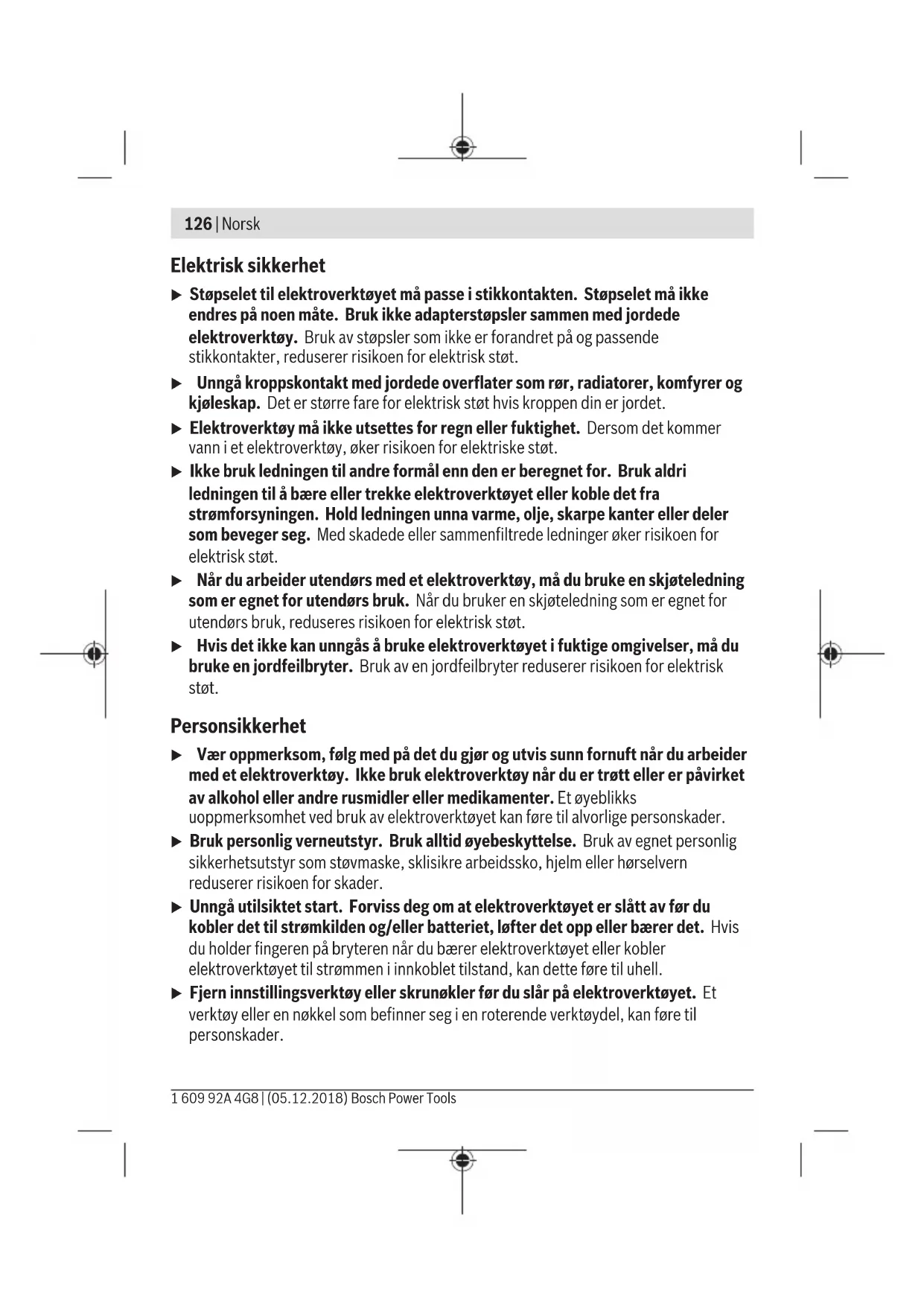 Vibrasjonsnivået og støyemisjonen som er angitt i disse anvisningene er målt i samsvar med en standardisert målemetode og kan brukes til sammenligning av elektroverktøy. Verdiene egner seg også til en foreløpig estimering av vibrasjonsnivået og støyutslippet. Angitt vibrasjonsnivå og støyutslipp representerer de hovedsakelige bruksområdene til elektroverktøyet. Men hvis elektroverktøyet brukes til andre formål, med andre innsatsverktøy eller utilstrekkelig vedlikehold, kan vibrasjonsnivået og støyutslippet avvike fra det som er angitt. Dette kan føre til en betydelig økning av vibrasjonsnivået og støyutslippet for hele arbeidstidsrommet. For en nøyaktig vurdering av vibrasjonsnivået og støyutslippet skal det også tas hensyn til de tidene verktøyet er slått av, eller går, men ikke faktisk er i bruk. Dette kan redusere vibrasjonsnivået og støyutslippet for hele arbeidstidsrommet betraktelig. Bestem ekstra sikkerhetstiltak til beskyttelse av brukeren mot vibrasjonenes virkning, som for eksempel: Vedlikehold av elektroverktøy og innsatsverktøy, holde hendene varme, organisere arbeidsforløpene. Montering u Ta ut batteriet før vedlikehold eller rengjøring av elektroverktøyet, før det skal foretas innstillinger på det og før skifte av tilbehørsdeler og oppbevaring av elektroverktøyet. Disse tiltakene forhindrer en utilsiktet starting av elektroverktøyet. Lade batteriet (se bilde C) u Bruk bare strømadapteren som er oppført i de tekniske spesifikasjonene. Bare denne strømadapteren er tilpasset li-ion-batteriet som kan brukes i ditt elektroverktøy. Merk: Batteriet er delvis ladet ved levering. For å sikre full effekt fra batteriet må du lade det helt opp med strømadapteren før første gangs bruk. Li-ion-batteriet kan lades opp til enhver tid uten at levetiden forkortes. Det skader ikke batteriet å avbryte oppladingen. 1 609 92A 4G8 | (05.12.2018) Bosch Power ToolsNorsk | 133 Li-ion-batteriet har ECP, Electronic Cell Protection, som beskytter mot dyputladning. Når batteriet er utladet, kobles elektroverktøyet ut med en beskyttelseskobling: Innsatsverktøyet beveger seg ikke lenger. u Ikke fortsett å trykke på av/på-bryteren etter automatisk utkobling av elektroverktøyet. Batteriet kan ta skade. Batteriet er utstyrt med en NTC-temperaturovervåking som kun aksepterer lading i temperaturområdet mellom 10 °C og 35 °C. Slik oppnås en lang levetid for batteriet. Du kan lade batteriet (5) separat eller i elektroverktøyet. – Fell opp dekselet (8). – Koble batteriet (5) til strømadapteren (10) ved bruk av en USB-kabel (11). – Sett strømadapteren (10) i stikkontakten. Ladingen starter. Indikatoren for batteriets ladenivå (6) viser ladefremdriften. Elektroverktøyet er deaktivert under ladingen og kan ikke brukes. Hvis den ikke skal brukes på lang tid, kobler du strømadapteren (10) fra strømnettet. Sette inn og ta ut batteriet (se bildeA) u Bruk ikke makt når du setter inn batteriet. Batteriet er konstruert er slik at det bare kan settes inn i elektroverktøyet i riktig posisjon. – Skyv batteriet (5) inn i batterirommet(12) til det stopper. – For å ta ut batteriet(5) trykker du på opplåsingsknappene (13) på batteriet og trekker det ut av batterirommet (12). Følg informasjonene om kassering. Indikator for batteriladenivå Indikatoren for batteriladenivå (6) aktiveres automatisk når batteriet (5) beveges. Indikatoren for batteriladenivå (6) slukker etter noen sekunder når batteriet (5) ikke beveges lenger. Under arbeid med elektroverktøyet er indikatoren for batteriladenivå (6) slått av. Lading Batteri separat eller i elektroverktøyet (ved bevegelse) Lading (batteri med tilkoblet strømadapter) 100% Grønn (kontinuerlig) Grønn (kontinuerlig) 100% − 50% Grønn (kontinuerlig) Grønn (blinker) Bosch Power Tools 1 609 92A 4G8 | (05.12.2018)134 | Norsk Lading Batteri separat eller i elektroverktøyet (ved bevegelse) Lading (batteri med tilkoblet strømadapter) 50% − 20% Gul (kontinuerlig) Grønn (blinker) 20% − 5% Rød (kontinuerlig) Grønn (blinker) 5% − 0% Rød (blinker) Grønn (blinker) Merknad: Hvis batteriet (5) har vært lagret og ikke vært i bruk på lang tid, kan det hende at indikatoren for batteriladenivå (6) ikke aktiveres. Dette beskytter batteriet (5) mot dyputlading. Indikatoren aktiveres igjen så snart batteriet (5) lades. I dette tilfellet forlenges batteriets ladetid. Indikatoren for batteriladenivå (6) slukker noen minutter etter at når batteriet (5) har blitt ladet helt opp. Merknad: Hvis indikatoren for batteriladenivå (6) blinker hvitt, er temperaturen utenfor den tillatte omgivelsestemperaturen. Ladingen begynner automatisk så snart tillatt temperatur er nådd. Under ladingen blinker indikatoren for batteriladenivå (6) grønt. Verktøyskifte (se bilde B) Åpne hurtigspennchucken (2) ved å dreie i dreieretning ➋ til verktøyet kan settes inn. Sett inn verktøyet. Skru hylsen til hurtigspennchucken (2)godt fast for hånd i rotasjonsretningen ➊. Støv-/sponavsuging Støv fra materialer som blyholdig maling, noen tresorter, mineraler og metall kan være helsefarlige. Berøring eller innånding av støv kan utløse allergiske reaksjoner og/eller åndedrettssykdommer hos brukeren eller personer som befinner seg i nærheten. Visse typer støv som eik- eller bøkstøv gjelder som kreftfremkallende, spesielt i kombinasjon med tilsetningsstoffer til trebearbeidelse (kromat, trebeskyttelsesmidler). Asbestholdig materiale må kun bearbeides av fagfolk. – Sørg for god ventilasjon av arbeidsplassen. – Det anbefales å bruke en støvmaske med filterklasse P2. Følg ditt lands gyldige forskrifter for de materialene som skal bearbeides. u Unngå støv på arbeidsplassen. Støv kan lett antennes. 1 609 92A 4G8 | (05.12.2018) Bosch Power ToolsNorsk | 135 Bruk Igangsetting u Pass på at dekselet til USB Type C