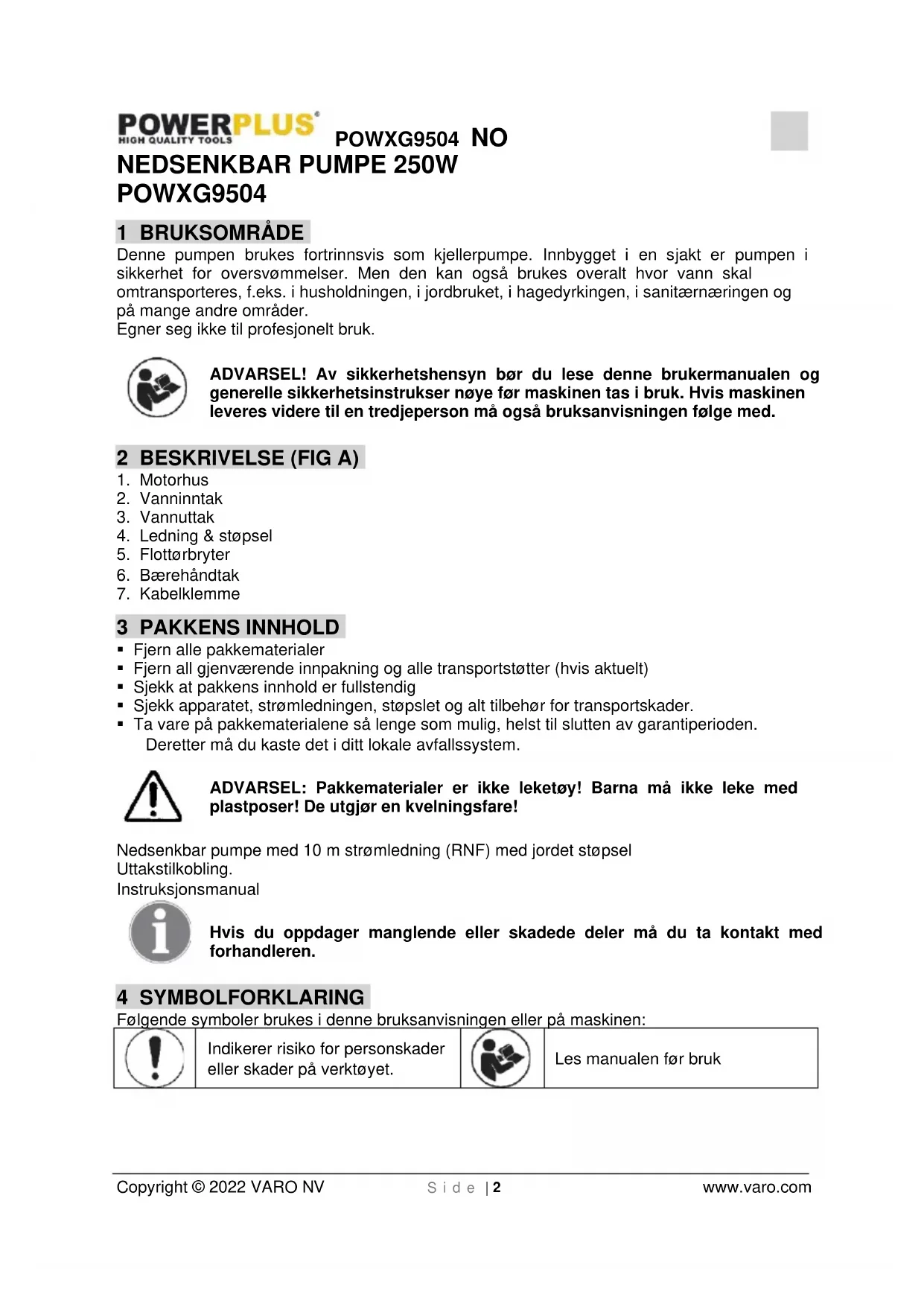 - stasjonært med fleksibel slangeledning Pass på! Under installasjonen må det sørges for at pumpen aldri henger fritt fra trykkledningen eller monteres på strømkabelen. Den nedsenkbare motorpumpen må henges etter bærehåndtaket som følger med, eller legges i bunnen af sjakten. For at pumpen skal sikres en god funksjon må sjaktbunnen holdes fri for slam og andre forurensninger. Ved for lav vannstand kan slammet i sjaktbunnen tørke inn og pumpen må hindres fra å starte. Derfor er det nødvendigt at den nedsenkbare motorpumpene sjekkes regelmessig (foreta startforsøk). Flottørbryteren må stilles inn slik at en igangkjøring til enhver tid er mulig. Råd Pumpesjakten bør minst ha dimensjonen 40 x 40 x 50 cm, slik at flottørbryteren kan bevege seg fritt. Nettilkopling Den nye dykkermotorpumpen har allerede et jordingskontaktstøpsel. Pumpen er bestemt for tilkopling til en jordingsstikkontakt 230 V - 50 Hz. Vær sikker på at stikkontakten er sterk nok (minst 6 A), og i perfekt stand. Før pumpestøpselet i stikkontakten og pumpen er klar til start.POWXG9504 NO Copyright © 2022 VARO NV S i d e | 4 www.varo.com Råd! Dersom nettledningen eller støpselet er kommet til skade pga. ytre påvirkning, kan kabelen ikke repareres! Kabelen må skiftes ut. 8 IGANGKJØRING Etter å ha lest installasjons- og bruksanvisningen nøye, kan pumpen settes i drift under følgende betingelser: