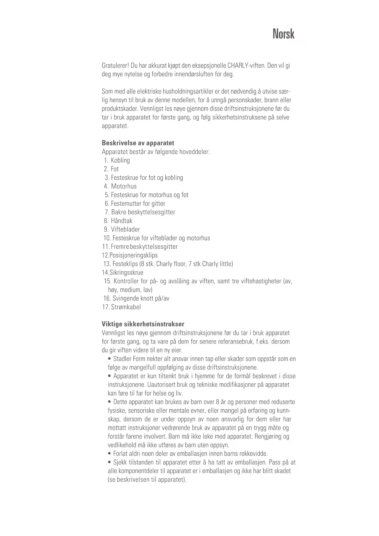 Viktige sikkerhetsinstrukser Vennligst les nøye gjennom driftsinstruksjonene før du tar i bruk apparatet for første gang, og ta vare på dem for senere referansebruk, f.eks. dersom du gir viften videre til en ny eier.