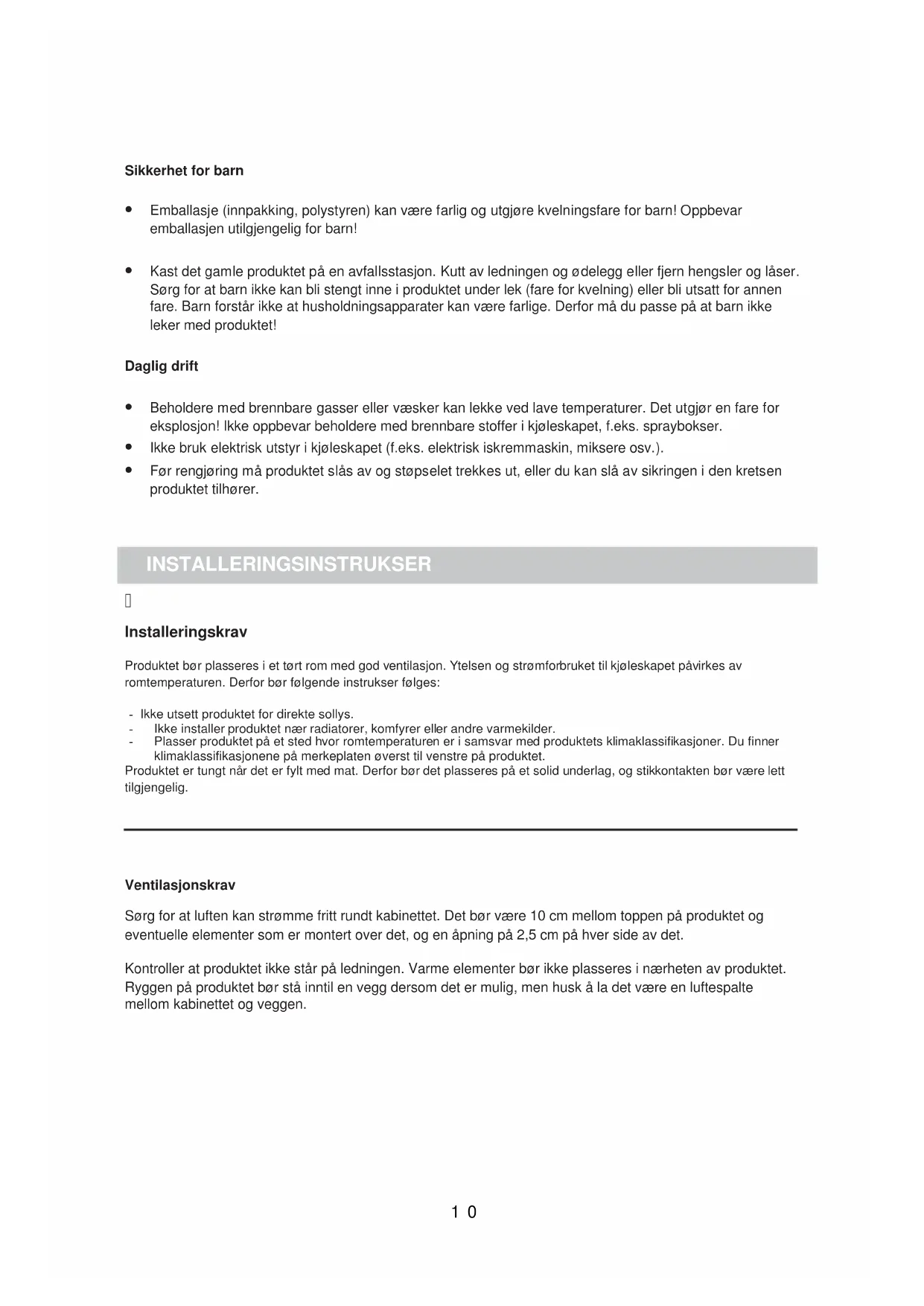 Installer kjøleskapet unna varmekilder og direkte sollys, og i et rom med god ventilasjon.