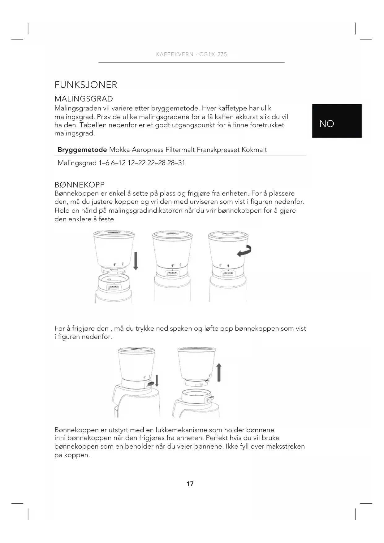 FUNKSJONER MALINGSGRAD Malingsgraden vil variere etter bryggemetode. Hver kaffetype har ulik malingsgrad. Prøv de ulike malingsgradene for å få kaffen akkurat slik du vil ha den. Tabellen nedenfor er et godt utgangspunkt for å nne foretrukket malingsgrad. BØNNEKOPP Bønnekoppen er enkel å sette på plass og frigjøre fra enheten. For å plassere den, må du justere koppen og vri den med urviseren som vist i guren nedenfor. Hold en hånd på malingsgradindikatoren når du vrir bønnekoppen for å gjøre den enklere å feste. For å frigjøre den , må du trykke ned spaken og løfte opp bønnekoppen som vist i guren nedenfor. Bønnekoppen er utstyrt med en lukkemekanisme som holder bønnene inni bønnekoppen når den frigjøres fra enheten. Perfekt hvis du vil bruke bønnekoppen som en beholder når du veier bønnene. Ikke fyll over maksstreken på koppen. Bryggemetode Mokka Aeropress Filtermalt Franskpresset Kokmalt Malingsgrad 1–6 6–12 12–22 22–28 28–3118