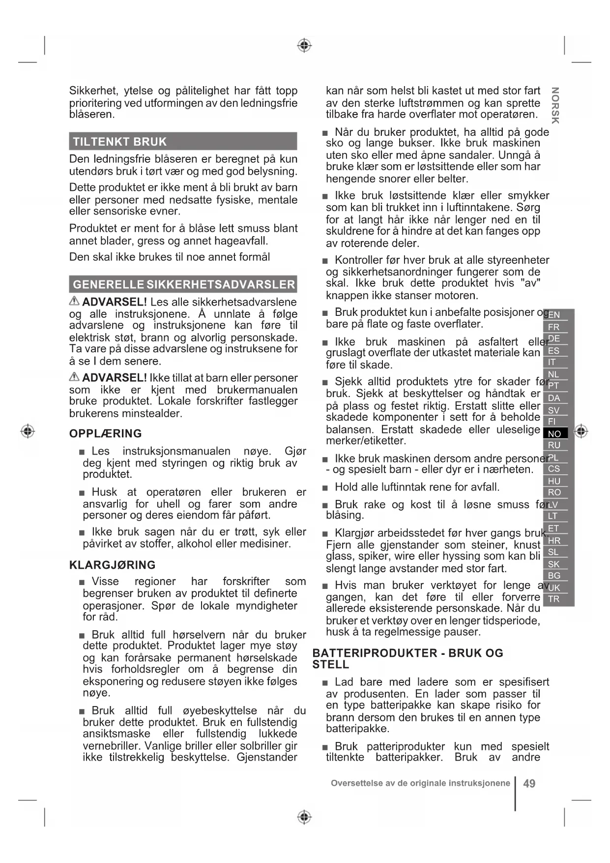 Sikkerhet, ytelse og pålitelighet har fått topp prioritering ved utformingen av den ledningsfrie blåseren. TILTENKT BRUK Den ledningsfrie blåseren er beregnet på kun utendørs bruk i tørt vær og med god belysning. Dette produktet er ikke ment å bli brukt av barn eller personer med nedsatte fysiske, mentale eller sensoriske evner. Produktet er ment for å blåse lett smuss blant annet blader, gress og annet hageavfall. Den skal ikke brukes til noe annet formål GENERELLE SIKKERHETSADVARSLER ADVARSEL! Les alle sikkerhetsadvarslene og alle instruksjonene. Å unnlate å følge advarslene og instruksjonene kan føre til elektrisk støt, brann og alvorlig personskade. Ta vare på disse advarslene og instruksene for å se I dem senere. ADVARSEL! Ikke tillat at barn eller personer som ikke er kjent med brukermanualen bruke produktet. Lokale forskrifter fastlegger brukerens minstealder. OPPLÆRING ■ Les instruksjonsmanualen nøye. Gjør deg kjent med styringen og riktig bruk av produktet. ■ Husk at operatøren eller brukeren er ansvarlig for uhell og farer som andre personer og deres eiendom får påført. ■ Ikke bruk sagen når du er trøtt, syk eller påvirket av stoffer, alkohol eller medisiner. KLARGJØRING ■ Visse regioner har forskrifter som begrenser bruken av produktet til definerte operasjoner. Spør de lokale myndigheter for råd. ■ Bruk alltid full hørselvern når du bruker dette produktet. Produktet lager mye støy og kan forårsake permanent hørselskade hvis forholdsregler om å begrense din eksponering og redusere støyen ikke følges nøye. ■ Bruk alltid full øyebeskyttelse når du bruker dette produktet. Bruk en fullstendig ansiktsmaske eller fullstendig lukkede vernebriller. Vanlige briller eller solbriller gir ikke tilstrekkelig beskyttelse. Gjenstander kan når som helst bli kastet ut med stor fart av den sterke luftstrømmen og kan sprette tilbake fra harde overflater mot operatøren. ■ Når du bruker produktet, ha alltid på gode sko og lange bukser. Ikke bruk maskinen uten sko eller med åpne sandaler. Unngå å bruke klær som er løstsittende eller som har hengende snorer eller belter. ■ Ikke bruk løstsittende klær eller smykker som kan bli trukket inn i luftinntakene. Sørg for at langt hår ikke når lenger ned en til skuldrene for å hindre at det kan fanges opp av roterende deler. ■ Kontroller før hver bruk at alle styreenheter og sikkerhetsanordninger fungerer som de skal. Ikke bruk dette produktet hvis "av" knappen ikke stanser motoren. ■ Bruk produktet kun i anbefalte posisjoner og bare på flate og faste overflater. ■ Ikke bruk maskinen på asfaltert eller gruslagt overflate der utkastet materiale kan føre til skade. ■ Sjekk alltid produktets ytre for skader før bruk. Sjekk at beskyttelser og håndtak er på plass og festet riktig. Erstatt slitte eller skadede komponenter i sett for å beholde balansen. Erstatt skadede eller uleselige merker/etiketter. ■ Ikke bruk maskinen dersom andre personer - og spesielt barn - eller dyr er i nærheten. ■ Hold alle luftinntak rene for avfall. ■ Bruk rake og kost til å løsne smuss før blåsing. ■ Klargjør arbeidsstedet før hver gangs bruk. Fjern alle gjenstander som steiner, knust glass, spiker, wire eller hyssing som kan bli slengt lange avstander med stor fart. ■ Hvis man bruker verktøyet for lenge av gangen, kan det føre til eller forverre allerede eksisterende personskade. Når du bruker et verktøy over en lenger tidsperiode, husk å ta regelmessige pauser.