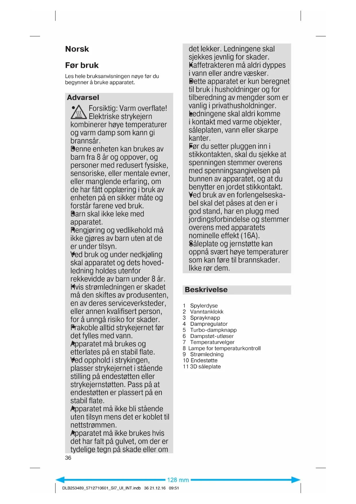 DLB253489_5712710601_SI7_UI_INT.indb 35 21.12.16 09:51Norsk Før bruk Les hele bruksanvisningen nøye før du begynner å bruke apparatet. Advarsel