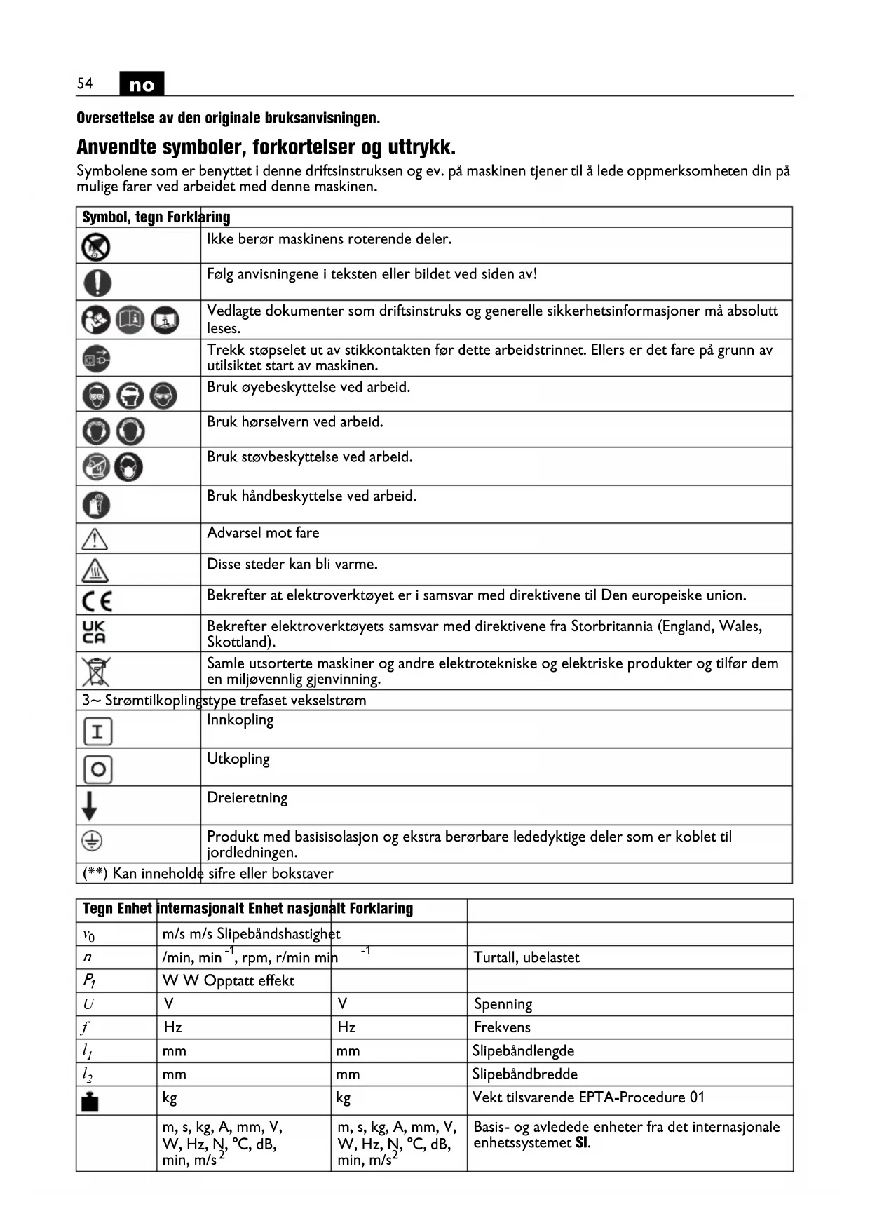 Oversettelse av den originale bruksanvisningen. Anvendte symboler, forkortelser og uttrykk. Symbolene som er benyttet i denne driftsinstruksen og ev. på maskinen tjener til å lede oppmerksomheten din på mulige farer ved arbeidet med denne maskinen. Symbol, tegn Forklaring Ikke berør maskinens roterende deler. Følg anvisningene i teksten eller bildet ved siden av! Vedlagte dokumenter som driftsinstruks og generelle sikkerhetsinformasjoner må absolutt leses. Trekk støpselet ut av stikkontakten før dette arbeidstrinnet. Ellers er det fare på grunn av utilsiktet start av maskinen. Bruk øyebeskyttelse ved arbeid. Bruk hørselvern ved arbeid. Bruk støvbeskyttelse ved arbeid. Bruk håndbeskyttelse ved arbeid. Advarsel mot fare Disse steder kan bli varme. Bekrefter at elektroverktøyet er i samsvar med direktivene til Den europeiske union. Bekrefter elektroverktøyets samsvar med direktivene fra Storbritannia (England, Wales, Skottland). Samle utsorterte maskiner og andre elektrotekniske og elektriske produkter og tilfør dem en miljøvennlig gjenvinning. 3~ Strømtilkoplingstype trefaset vekselstrøm Innkopling Utkopling Dreieretning Produkt med basisisolasjon og ekstra berørbare lededyktige deler som er koblet til jordledningen. (**) Kan inneholde sifre eller bokstaver Tegn Enhet internasjonalt Enhet nasjonalt Forklaring