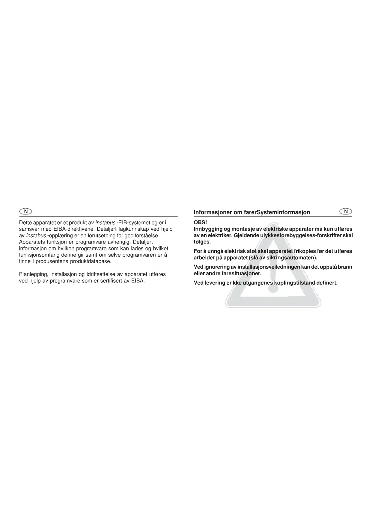 Dette apparatet er et produkt av instabus -EIB-systemet og er i samsvar med EIBA-direktivene. Detaljert fagkunnskap ved hjelp av instabus -opplæring er en forutsetning for god forståelse. Apparatets funksjon er programvare-avhengig. Detaljert informasjon om hvilken programvare som kan lades og hvilket funksjonsomfang denne gir samt om selve programvaren er å finne i produsentens produktdatabase.