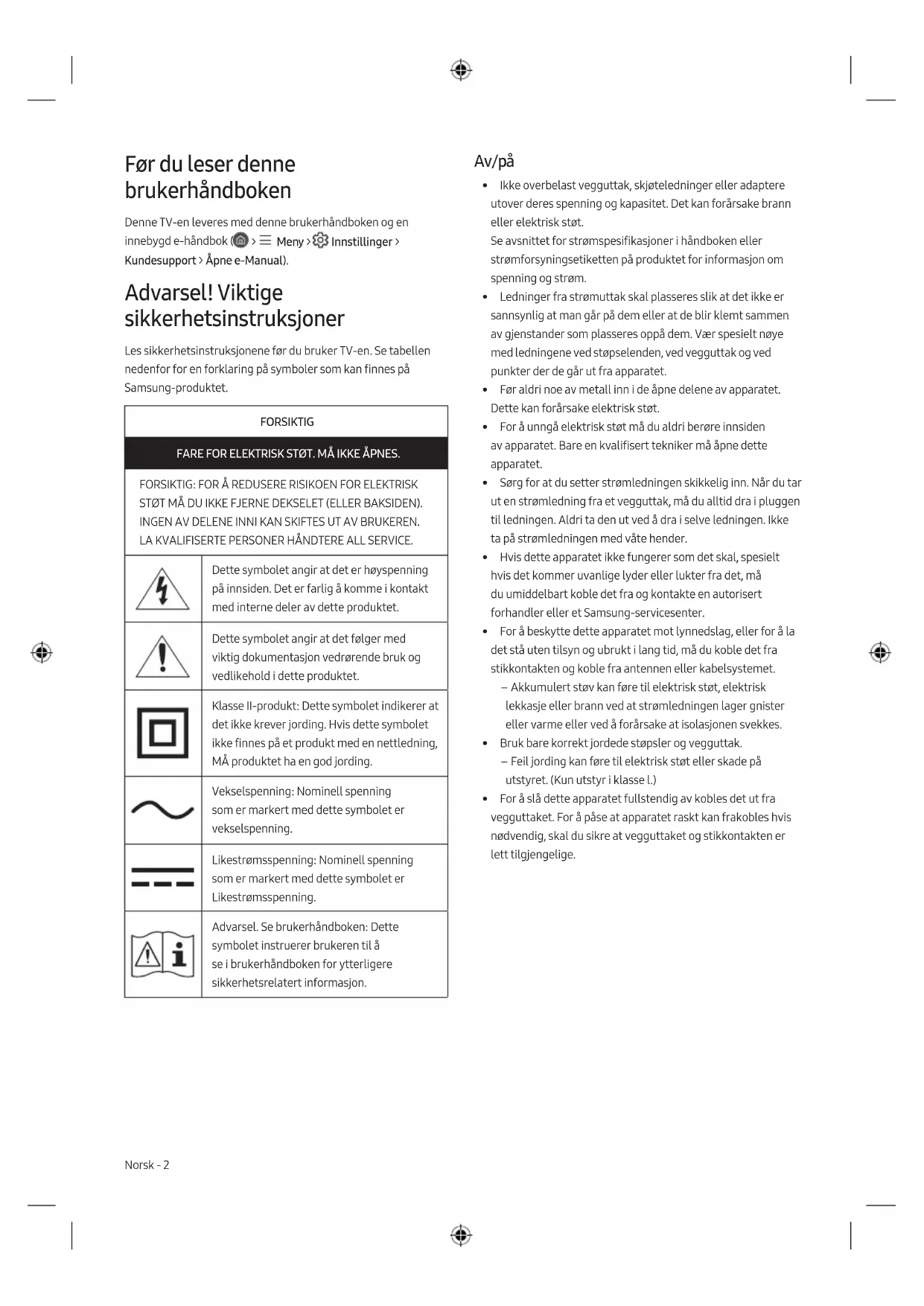 STØT MÅ DU IKKE FJERNE DEKSELET (ELLER BAKSIDEN). INGEN AV DELENE INNI KAN SKIFTES UT AV BRUKEREN. LA KVALIFISERTE PERSONER HÅNDTERE ALL SERVICE. Dette symbolet angir at det er høyspenning på innsiden. Det er farlig å komme i kontakt med interne deler av dette produktet. Dette symbolet angir at det følger med viktig dokumentasjon vedrørende bruk og vedlikehold i dette produktet. Klasse II-produkt: Dette symbolet indikerer at det ikke krever jording. Hvis dette symbolet ikke finnes på et produkt med en nettledning, MÅ produktet ha en god jording. Vekselspenning: Nominell spenning som er markert med dette symbolet er vekselspenning. Likestrømsspenning: Nominell spenning som er markert med dette symbolet er Likestrømsspenning. Advarsel. Se brukerhåndboken: Dette symbolet instruerer brukeren til å se i brukerhåndboken for ytterligere sikkerhetsrelatert informasjon. Av/på