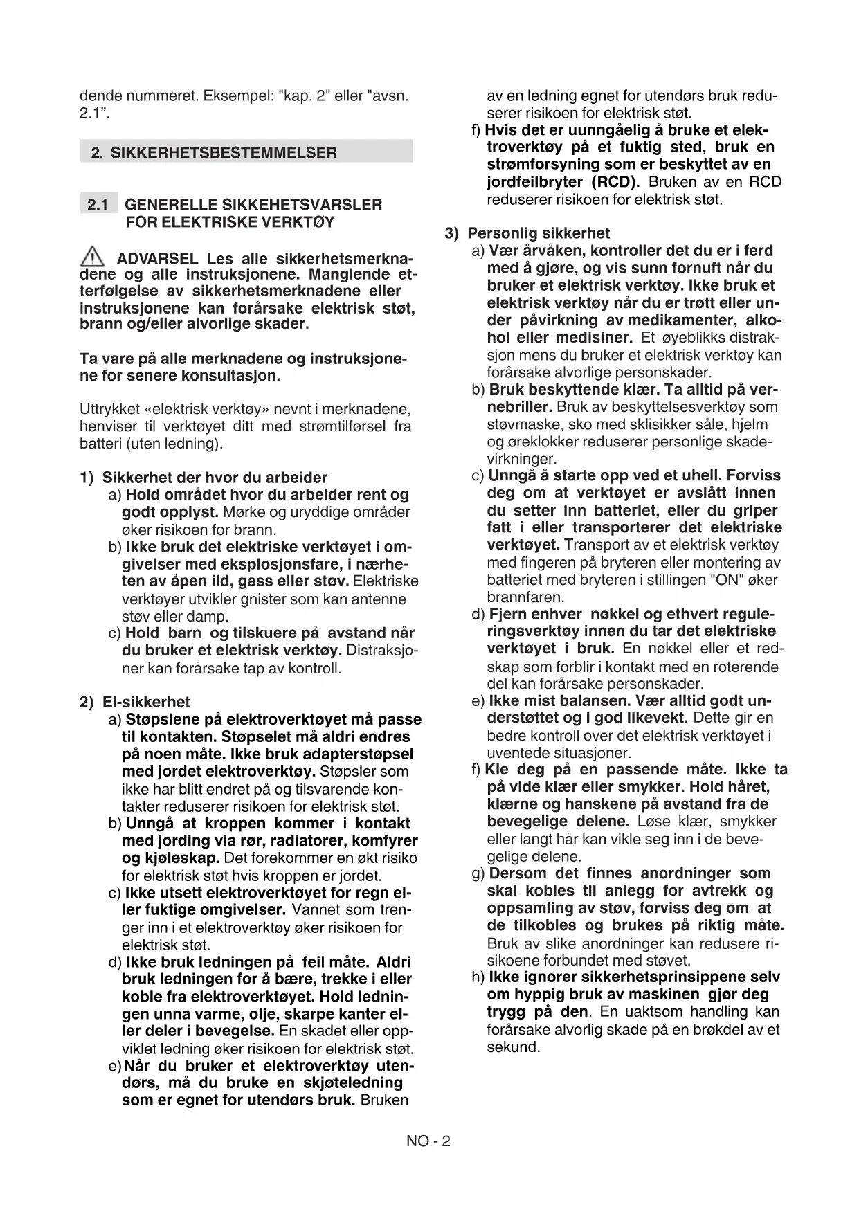 a) Vær årvåken, kontroller det du er i ferd med å gjøre, og vis sunn fornuft når du bruker et elektrisk verktøy. Ikke bruk et elektrisk verktøy når du er trøtt eller un- der påvirkning av medikamenter, alko- hol eller medisiner. Et øyeblikks distrak- sjon mens du bruker et elektrisk verktøy kan forårsake alvorlige personskader. b) Bruk beskyttende klær. Ta alltid på ver- nebriller. Bruk av beskyttelsesverktøy som støvmaske, sko med sklisikker såle, hjelm og øreklokker reduserer personlige skade- virkninger. c) Unngå å starte opp ved et uhell. Forviss deg om at verktøyet er avslått innen du setter inn batteriet, eller du griper fatt i eller transporterer det elektriske verktøyet. Transport av et elektrisk verktøy med ngeren på bryteren eller montering av batteriet med bryteren i stillingen "ON" øker brannfaren. d) Fjern enhver nøkkel og ethvert regule- ringsverktøy innen du tar det elektriske verktøyet i bruk. En nøkkel eller et red- skap som forblir i kontakt med en roterende del kan forårsake personskader. e) Ikke mist balansen. Vær alltid godt un- derstøttet og i god likevekt. Dette gir en bedre kontroll over det elektrisk verktøyet i uventede situasjoner. f) Kle deg på en passende måte. Ikke ta på vide klær eller smykker. Hold håret, klærne og hanskene på avstand fra de bevegelige delene. Løse klær, smykker eller langt hår kan vikle seg inn i de beve- gelige delene. g) Dersom det nnes anordninger som skal kobles til anlegg for avtrekk og oppsamling av støv, forviss deg om at de tilkobles og brukes på riktig måte. Bruk av slike anordninger kan redusere ri- sikoene forbundet med støvet. h) Ikke ignorer sikkerhetsprinsippene selv om hyppig bruk av maskinen gjør deg trygg på den. En uaktsom handling kan forårsake alvorlig skade på en brøkdel av et sekund.NO - 3