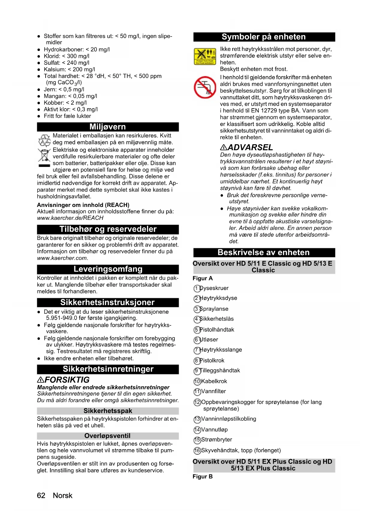 /l) ● Jern: < 0,5 mg/l ● Mangan: < 0,05 mg/l ● Kobber: < 2 mg/l ● Aktivt klor: < 0,3 mg/l ● Fritt for fæle lukter Miljøvern Materialet i emballasjen kan resirkuleres. Kvitt deg med emballasjen på en miljøvennlig måte. Elektriske og elektroniske apparater inneholder verdifulle resirkulerbare materialer og ofte deler som batterier, batteripakker eller olje. Disse kan utgjøre en potensiell fare for helse og miljø ved feil bruk eller feil avfallsbehandling. Disse delene er imidlertid nødvendige for korrekt drift av apparatet. Ap- parater merket med dette symbolet skal ikke kastes i husholdningsavfallet. Anvisninger om innhold (REACH) Aktuell informasjon om innholdsstoffene finner du på: www.kaercher.de/REACH Tilbehør og reservedeler Bruk bare originalt tilbehør og originale reservedeler; de garanterer for en sikker og problemfri drift av apparatet. Informasjon om tilbehør og reservedeler finner du på www.kaercher.com. Leveringsomfang Kontroller at innholdet i pakken er komplett når du pak- ker ut. Manglende tilbehør eller transportskader skal meldes til forhandleren. Sikkerhetsinstruksjoner ● Det er viktig at du leser sikkerhetsinstruksjonene 5.951-949.0 før første igangkjøring. ● Følg gjeldende nasjonale forskrifter for høytrykks- vaskere. ● Følg gjeldende nasjonale forskrifter om forebygging av ulykker. Høytrykksvaskere må testes regelmes- sig. Testresultatet må registreres skriftlig. ● Ikke endre enheten eller tilbehøret. Sikkerhetsinnretninger 몇 FORSIKTIG Manglende eller endrede sikkerhetsinnretninger Sikkerhetsinnretningene tjener til din egen sikkerhet. Du må aldri forandre eller omgå sikkerhetsinnretninger. Sikkerhetsspak Sikkerhetsspaken på høytrykkspistolen forhindrer at en- heten slås på ved et uhell. Overløpsventil Hvis høytrykkspistolen er lukket, åpnes overløpsven- tilen og hele vannvolumet vil strømme tilbake til pum- pens sugeside. Overløpsventilen er stilt inn av produsenten og forse- glet. Innstilling skal bare utføres av kundeservice. Symboler på enheten Beskrivelse av enheten Oversikt over HD 5/11 E Classic og HD 5/13 E Classic Figur A 1 Dyseskruer 2 Høytrykksdyse 3 Spraylanse 4 Sikkerhetslås 5 Pistolhåndtak 6 Utløser 7 Høytrykksslange 8 Pistolkrok 9 Tilleggshåndtak 10 Kabelkrok 11 Vannfilter 12 Oppbevaringskogger for sprøytelanse (for lang sprøytelanse) 13 Vanninnløpstilkobling 14 Vannutløp 15 Strømbryter 16 Skyvehåndtak, topp (forlenget) Oversikt over HD 5/11 EX Plus Classic og HD 5/13 EX Plus Classic Figur B Ikke rett høytrykksstrålen mot personer, dyr, strømførende elektrisk utstyr eller selve en- heten. Beskytt enheten mot frost. I henhold til gjeldende forskrifter må enheten aldri brukes med vannforsyningsnettet uten beskyttelsesutstyr. Sørg for at tilkoblingen til vannuttaket ditt, som høytrykksvaskeren dri- ves med, er utstyrt med en systemseparator i henhold til EN 12729 type BA. Vann som har strømmet gjennom en systemseparator, er klassifisert som udrikkelig. Koble alltid sikkerhetsutstyret til vanninntaket og aldri di- rekte til enheten. 몇 ADVARSEL Den høye dyseutløpshastigheten til høy- trykksvannstrålen resulterer i et høyt støyni- vå som kan forårsake ubehag eller hørselsskader (f.eks. tinnitus) for personer i umiddelbar nærhet. Et kontinuerlig høyt støynivå kan føre til døvhet. ● Bruk det foreskrevne personlige verne- utstyret. ● Høye støynivåer kan svekke vokalkom- munikasjon og svekke eller hindre din evne til å oppfatte akustiske varselsigna- ler. Arbeid aldri alene. En annen person må være til stede utenfor arbeidsområ- det.Norsk 63 1 Dyseskruer 2 Høytrykksdyse 3 Spraylanse 4 Sikkerhetslås 5 Pistolhåndtak 6 Utløser 7 Høytrykksslange 8 Skyvehåndtak, topp (forlenget) 9 Tilleggshåndtak 10 Kabelkrok 11 Vannfilter 12 Oppbevaringskogger for sprøytelanse (for lang sprøytelanse) 13 Vanninnløpstilkobling 14 Vannutløp 15 Strømbryter 16 Håndsveiv 17 Spraylanseholder 18 Smussblåser Første oppstart FARE Fare for personskader på grunn av elektrisk støt La kun autoriserte tekniske spesialister installere vann- forsyning, elektriske tilkoblinger og høytrykksnettverk. Fargekoding ● Kontrollelementene for rengjøringsprosessen er gu- le. Utpakking