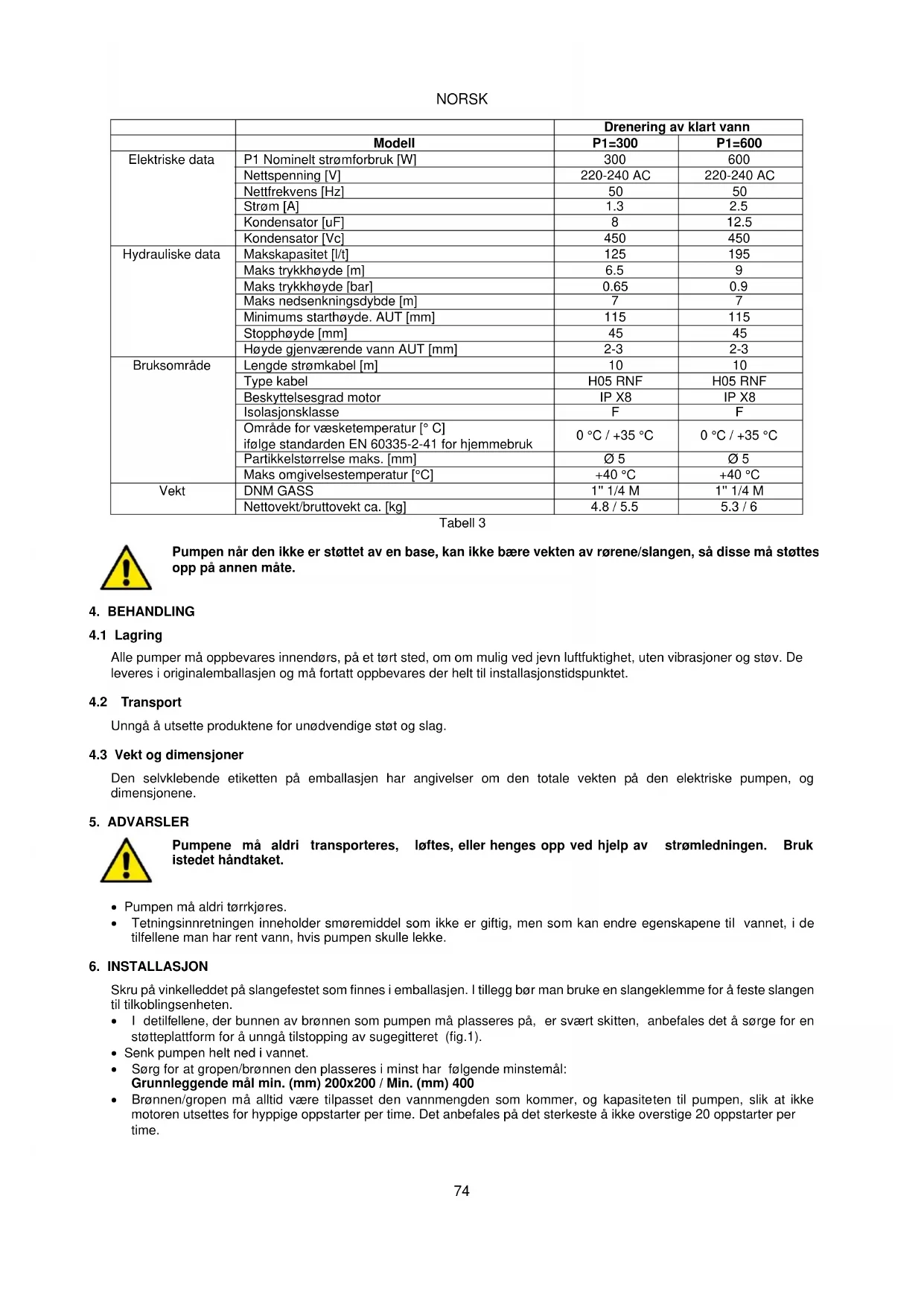 Pumpene må aldri transporteres, løftes, eller henges opp ved hjelp av strømledningen. Bruk istedet håndtaket.