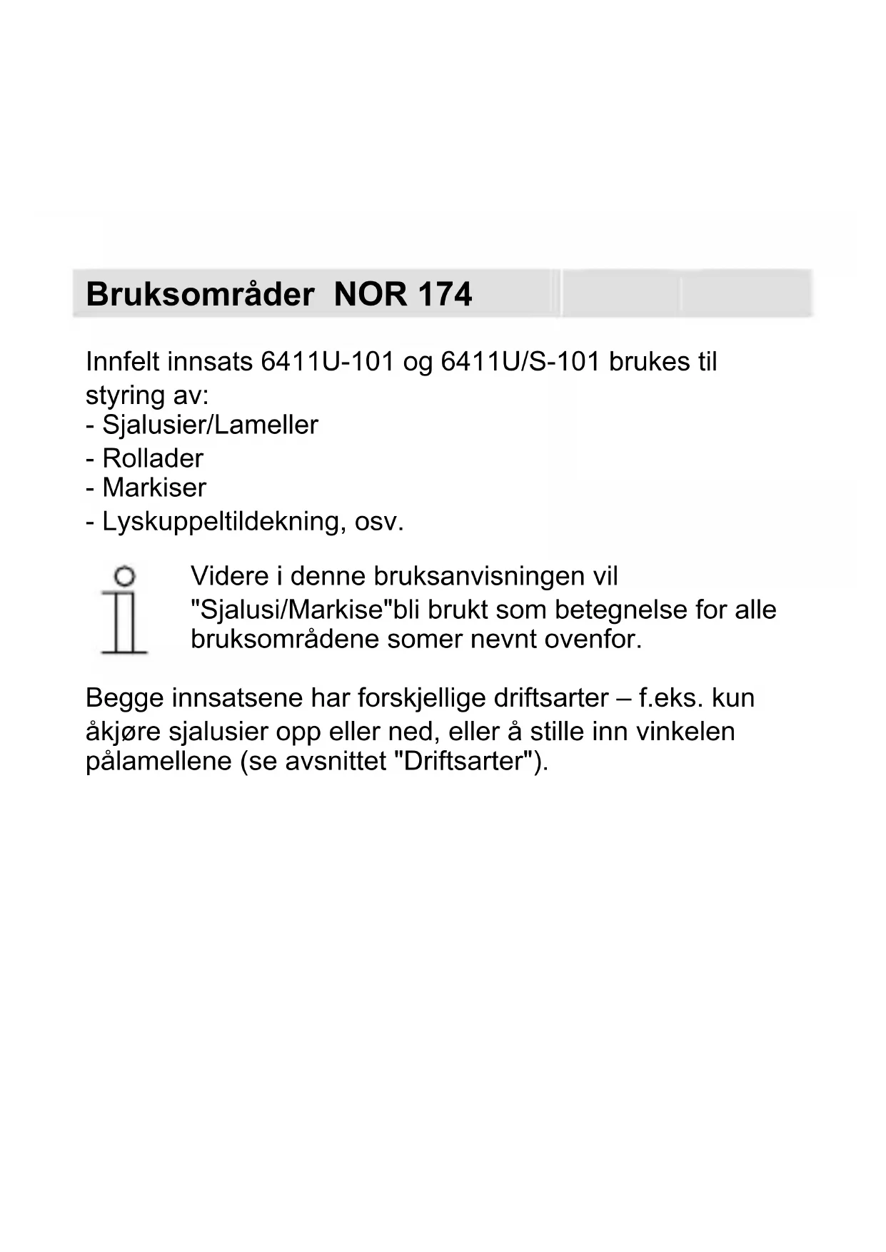 Videre i donne bruksanvisningen vil "Sjalusi/Markise"bli brukt som betegnelse for alle bruksområdene somer nevnt ovenfor.