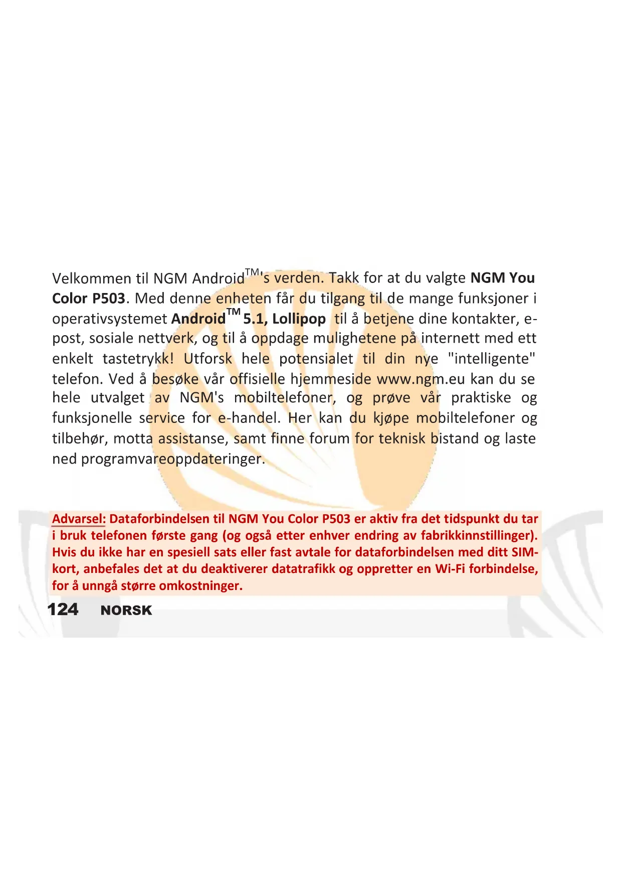 Velkommen til NGM Android™s verden. Takk for at du valgte NGM You Color P503. Med/DDne enheten far du tilgang til de mange funksjoner i operativsystemet Android™ 5.1, Lollipop til abetjene dine kontakter, epost, sosiale nettverk, og til aoppage mulighetene pa internett med ettenkelt tastetrykk! Utforsk hele potensialet til din nye "intelligente" Telefon. Ved a beske var offisielle hjemmeside www.ngm.eu kan du se hele utvalget av NGM's mobiltelefoner, og prove var praktiske og funksjonelle service for e-handel. Her kan du kjpe mobiltelefoner og tilbehør, motta assistanse, samt finne forum for tekisk bistand og lastened programvareoppateringer.