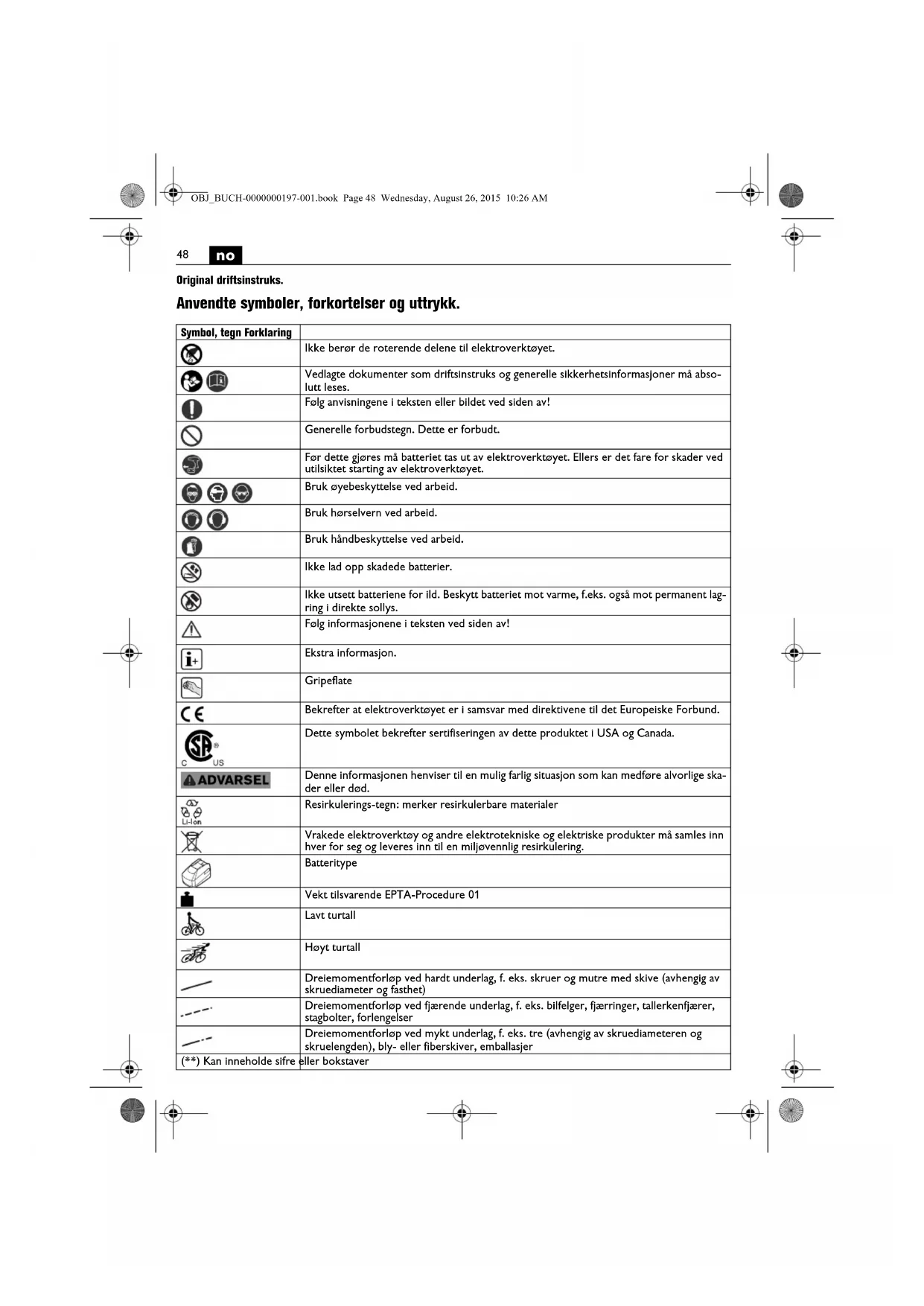 | [C5C8] | Vrakede elektroverktøy og andre elektrotekniske og elektriske produkter må samles inn hver for seg og leveres inn til en miljøvennlig resirkulering. |