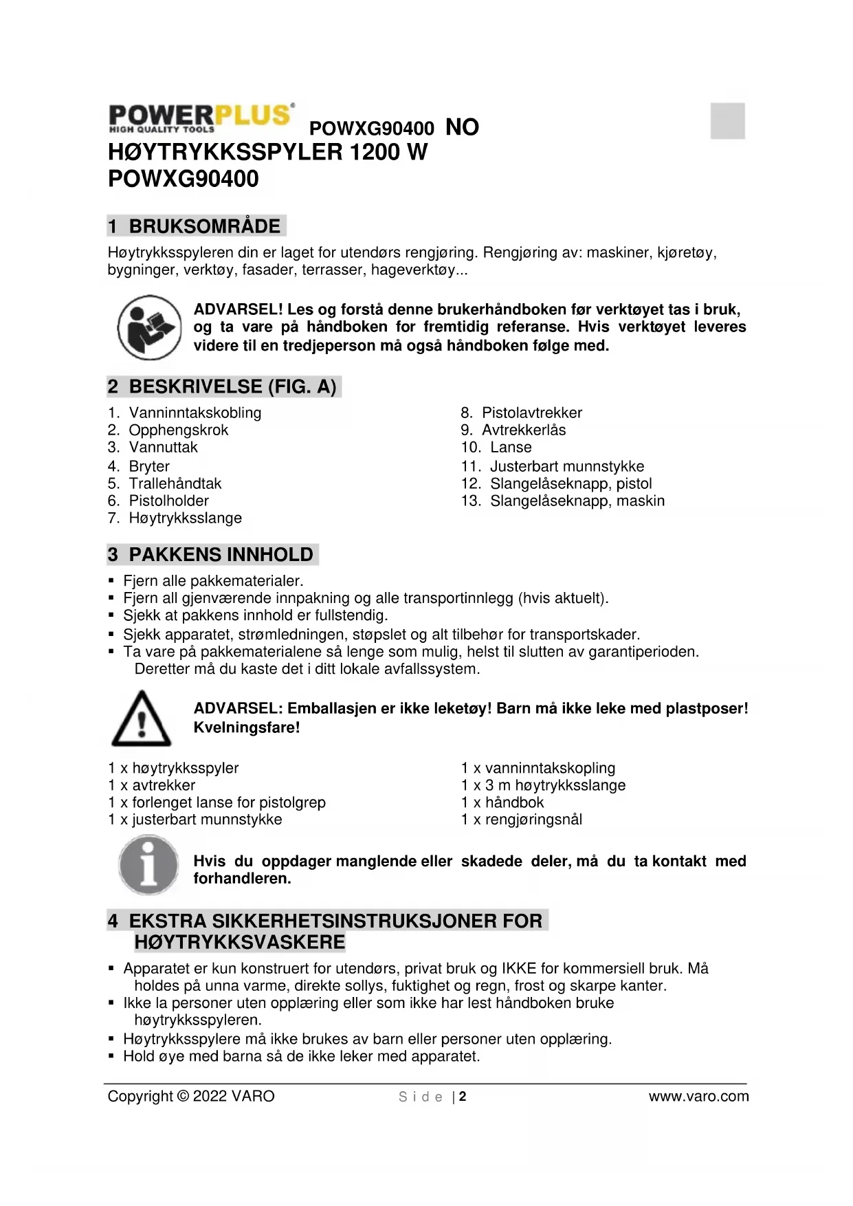 Apparatet vil ikke state. Støpslet står ikke i. Sett i støpslet. Defekt stikkontakt. Bruk en annen stikkontakt. Defekt skjøteledning. Prøv uten skjøteledning. Ujevnt trykk Pumpen suger luft. Sjekk at slanger og koblinger er tette. Ventiler er skitne, slitte eller fastkilte. Kontakt nærmeste servicesenter. Utilstrekkelig vannforsyning. Øk vanntrykket, sjekk om vannslangen er blokkert og/eller bytt til en større slange. Pumpepakningen er slitt. Kontakt nærmeste servicesenter. Apparatet stopper. Feil nettspenning. Kontroller at nettspenningen tilsvarer spesifikasjonene på typeskiltet. Varmesensoren er aktivert. La maskinen kjøle seg i 5 minutter. Munnstykket er delvis blokkert. Rengjør munnstykket med en nål og ved å sprøyte vann baklengs gjennom munnstykket. Ampertallet øker. Prøv uten skjøteledning. Apparatet pulserer. Luft i slange/pumpe. La apparatet gå med åpen avtrekker til vanlig brukstrykk gjenopprettes. Utilstrekkelig vannforsyning Øk vanntrykket, sjekk om vannslangen er blokkert og/eller bytt til en større slange. Munnstykket er delvis blokkert. Rengjør munnstykket med en nål og ved å sprøyte vann baklengs gjennom munnstykket. Vannfilteret er tett. Rengjør filteret. Knekk på slangen. Rett ut slangen. Apparatet starter og stopper av seg selv. Pumpen og/eller pistolen lekker. Kontakt nærmeste servicesenter. Ingen vannforsyning. Koble til inntaksvannet. Apparatet starter, men det kommer ikke noe vann ut. Vannfilteret er tett. Rengjør filteret. Munnstykket er tett. Rengjør munnstykket med en nål og ved å sprøyte vann baklengs gjennom munnstykket.POWXG90400 DA Copyright © 2022 VARO S i d e | 1 www.varo.com 1 ANVENDELSE ................................................................................. 2