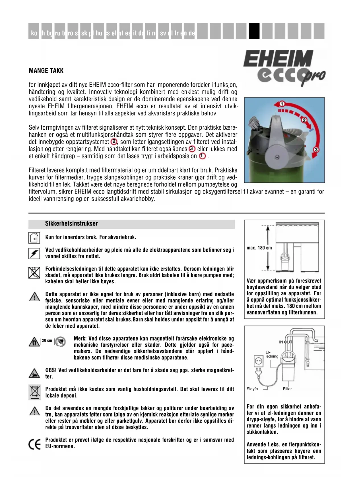 3MANGE TAKK for innkjøpet av ditt nye EHEIM ecco-filter som har imponerende fordeler i funksjon, håndtering og kvalitet. Innovativ teknologi kombinert med enklest mulig drift og vedlikehold samt karakteristisk design er de dominerende egenskapene ved denne nyeste EHEIM filtergenerasjonen. EHEIM ecco er resultatet av et intensivt utvik- lingsarbeid som tar hensyn til alle aspekter ved akvaristers praktiske behov. Selv formgivingen av filteret signaliserer et nytt teknisk konsept. Den praktiske bære- hanken er også et multifunksjonshåndtak som styrer flere oppgaver. Det aktiverer det innebygde oppstartsystemet , som letter igangsettingen av filteret ved instal- lasjon og etter rengjøring. Med håndtaket kan filteret også åpnes eller lukkes med et enkelt håndgrep – samtidig som det låses trygt i arbeidsposisjon . Filteret leveres komplett med filtermaterial og er umiddelbart klart for bruk. Praktiske kurver for filtermedier, trygge slangekoblinger og praktiske kraner gjør drift og ved- likehold til en lek. Takket være det nøye beregnede forholdet mellom pumpeytelse og filtervolum, sikrer EHEIM ecco langtidsdrift med stabil sirkulasjon og oksygentilførsel til akvarievannet – en garanti for ideell vannrensing og en suksessfull akvariehobby.