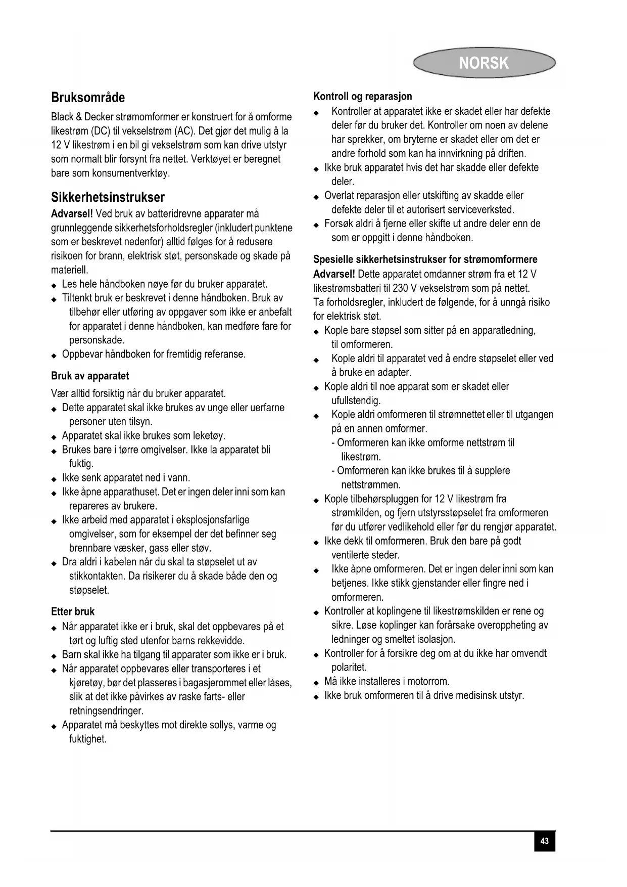 Black & Decker strømomformer er konstrukt for Å omformelikestrøm (DC) til vekselstrøm (AC). Det gjør det mulig à la 12 V likestrøm i en bil gi vekselstrøm som kan drive utstyr som normalt blir forsyt fra nettet. Verktøyet er beregnet bare som konsumentverktøy.