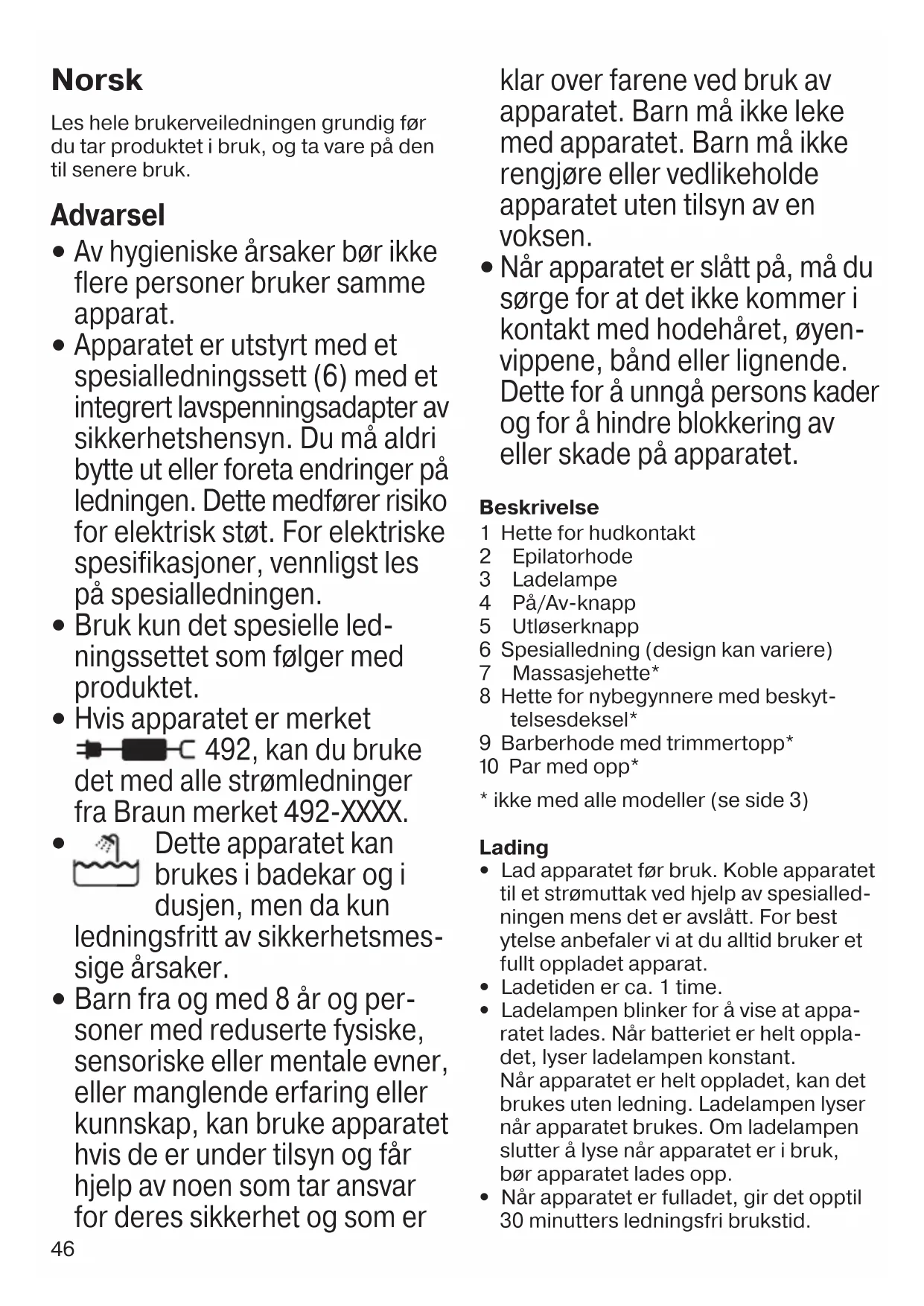 Når apparatet er slått på, må du sørge for at det ikke kommer i kontakt med hodehåret, øyen- vippene, bånd eller lignende. Dette for å unngå persons kader og for å hindre blokkering av eller skade på apparatet. Beskrivelse 1 Hette for hudkontakt 2 Epilatorhode 3 Ladelampe 4 På/Av-knapp 5 Utløserknapp 6 Spesialledning (design kan variere) 7 Massasjehette* 8 Hette for nybegynnere med beskyt- telsesdeksel* 9 Barberhode med trimmertopp* 0 Par med opp*