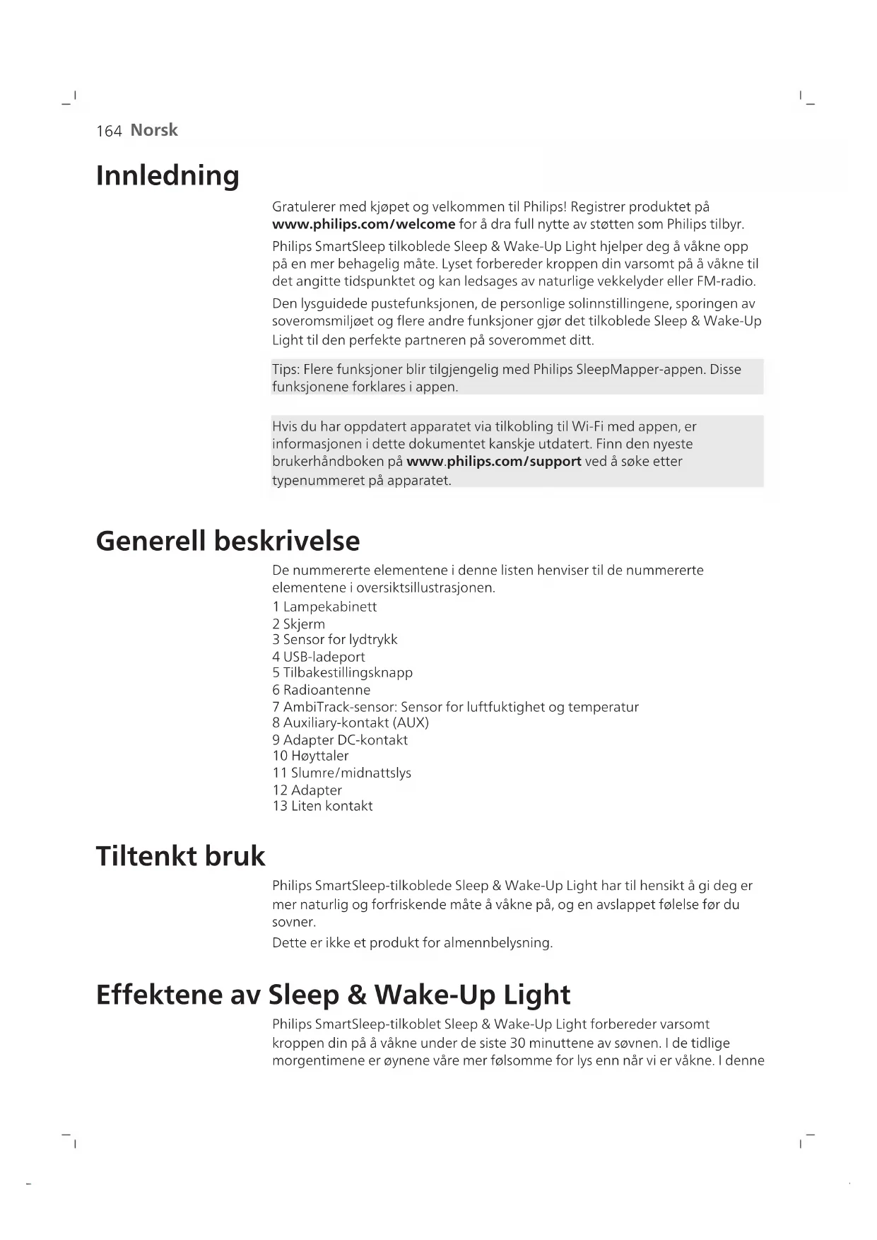IEC 62368: Audio-/videoutstyr, IT-utstyr og kommunikasjonsteknologiutstyr.167 Norsk Elektromagnetiske felt (EMF) Dette Philips-apparatet overholder alle aktuelle standarder og forskrifter for eksponering for elektromagnetiske felt. Interaktive menyikoner Vekkeprofil/Alarm Lysintensitet og lys på/av Gå tilbake til et høyere nivå i menyen Innstillinger Lyder Bekreft og lagre innstilling Avslapningsprogrammer AUX-uttak Radio Aktiver Wi-Fi Deaktiver Wi-Fi Endre alarminnstillinger Skjerminnstillinger og - lysstyrke Velg naturlig lyd Avvis alarm Aktiver tidsavbrudd for skjerm Deaktiver tidsavbrudd for skjerm Deaktiver alarm Aktiver lydrespons Deaktiver lydrespons Veiledning om lyd og lys Solnedgangssimulering Varighet for vekkeprofilen Slett vekkeprofil Ukedager RelaxBreathe RelaxBreathe-rytme Velg ukedag Opphev valg av ukedag Varighet av et program Start leggetid Start program Stopp program Koble apparatet ditt til Wi-Fi Hvis du har oppdatert apparatet via tilkobling til Wi-Fi med appen, er informasjonen i dette dokumentet kanskje utdatert. Du finner den nyeste brukerhåndboken på www.philips.com/support. Philips forbeholder seg retten til å oppdatere maskinvaren til apparatet.168 Norsk Enkel konfigurasjon av Wi-Fi Last ned Philips SleepMapper-appen fra Google Play eller App Store på mobiltelefonen din. Se informasjonen i Google Play eller App Store for å kontrollere at mobiltelefonen din er kompatibel med appen. Du kan enkelt konfigurere Wi-Fi-tilkoblingen til ditt tilkoblede Sleep & Wake-Up Light. Du trenger bare å fullføre konfigurasjonen for å installere Sleep & Wake-Up Light og koble det til hjemmenettverket ditt én gang. Konfigurasjonen vil ta omtrent 5–10 minutter. Konfigurasjonsveilederen for tilkoblet Sleep & Wake-Up Light 1 Når du bruker det tilkoblede Sleep & Wake-Up Light for første gang, starter en konfigurasjonsveiviser på apparatet. 2 Når du har valgt ditt språk på skjermen på apparatet, fortsetter du i appen. Kontroller at appen er åpen på mobiltelefonen din. 3 Følg instruksjonene i appen for å koble apparatet ditt til Wi-Fi-nettverket. Hvis du har problemer med å koble til apparatet, kan du se i støttedelen i appen eller gjenstandene som er nevnt i feilsøkingsdelen i denne brukerhåndboken (se 'Feilsøking').
