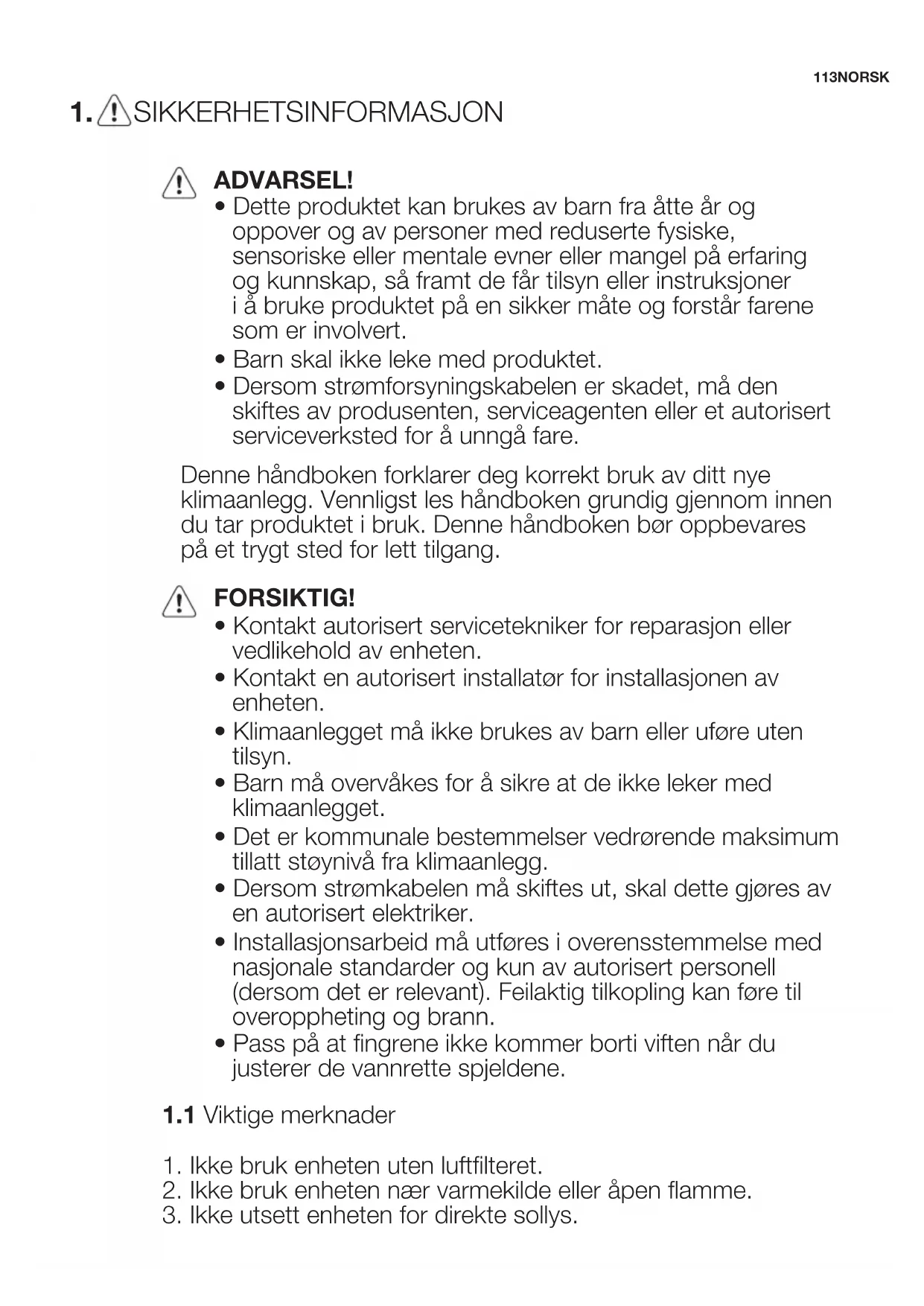 - Klimaanlegget må ikke brukes av barn eller uføre uten tilsyn