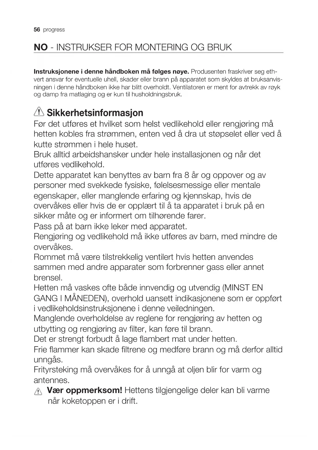 E14 Spänning (V) Storlek (mm) 220-240 35x102 (Diameter x Längd) Kod ILCOS D (överensstämmer med IEC 61231) DRBB/C-3-220-240-E14-35/10256 progress NO - INSTRUKSER FOR MONTERING OG BRUK Instruksjonene i denne håndboken må følges nøye. Produsenten fraskriver seg eth- vert ansvar for eventuelle uhell, skader eller brann på apparatet som skyldes at bruksanvis- ningen i denne håndboken ikke har blitt overholdt. Ventilatoren er ment for avtrekk av røyk og damp fra matlaging og er kun til husholdningsbruk. Sikkerhetsinformasjon Før det utføres et hvilket som helst vedlikehold eller rengjøring må hetten kobles fra strømmen, enten ved å dra ut støpselet eller ved å kutte strømmen i hele huset. Bruk alltid arbeidshansker under hele installasjonen og når det utføres vedlikehold. Dette apparatet kan benyttes av barn fra 8 år og oppover og av personer med svekkede fysiske, følelsesmessige eller mentale egenskaper, eller manglende erfaring og kjennskap, hvis de overvåkes eller hvis de er opplært til å ta apparatet i bruk på en sikker måte og er informert om tilhørende farer. Pass på at barn ikke leker med apparatet. Rengjøring og vedlikehold må ikke utføres av barn, med mindre de overvåkes. Rommet må være tilstrekkelig ventilert hvis hetten anvendes sammen med andre apparater som forbrenner gass eller annet brensel. Hetten må vaskes ofte både innvendig og utvendig (MINST EN GANG I MÅNEDEN), overhold uansett indikasjonene som er oppført i vedlikeholdsinstruksjonene i denne veiledningen. Manglende overholdelse av reglene for rengjøring av hetten og utbytting og rengjøring av filter, kan føre til brann. Det er strengt forbudt å lage flambert mat under hetten. Frie flammer kan skade filtrene og medføre brann og må derfor alltid unngås. Frityrsteking må overvåkes for å unngå at oljen blir for varm og antennes. Vær oppmerksom! Hettens tilgjengelige deler kan bli varme når koketoppen er i drift.progress 57 Sikkerhetsinstruksjoner Bruk kun samme type lyspære som indikeres i avsnittet vedlikehold/utbytting av lyspære i denne veiledningen når lyspæren skal byttes ut. Vær oppmerksom! Ikke kobl apparatet til strømnettet før installasjonen er helt ferdig. Når det gjelder tekniske mål og sikkerhet for røykuttak, følg nøye alle lokale forskrifter og regler. Oppsugd luft må ikke føres inn i et rør som benyttes som uttak for apparater med gassforbrenning eller annen brensel. Ikke bruk hetten uten lyspære eller med feilmontert lyspære, da det finnes fare for elektriske støt. Ikke bruk hetten med feilmontert rist! Hetten må ALDRI brukes som støtteflate, med mindre dette er uttrykkelig indikert. Bruk kun de festeskruene som leveres sammen med apparatet for å utføre installasjonen eller, hvis de ikke utleveres, kjøp riktige skruer. Bruk riktig lengde på skruene som er oppført i Installasjonsveiledningen. Vennligst ta kontakt med et autorisert servicesenter eller lignende kvalifisert personell hvis man er i tvil. Vær oppmerksom! Manglende installasjon av skruer og festeanordninger i samsvar med disse instruksjonene kan føre til elektriske farer. Miljøvern Resirkuler materialer som er merket med symbolet . Legg emballasjen i riktige beholdere for å resirkulere det. Bidrar til å beskytte miljøet, menneskers helse og for å resirkulere avfall av elektriske og elektroniske produkter. Ikke kast produkter som er merket med symbolet sammen med husholdningsavfallet. Produktet kan leveres der hvor tilsvarende produkt selges eller på miljøstasjonen i kommunen. Kontakt kommunen for nærmere opplysninger. Bruk Ventilatoren er laget for å brukes med direkte avtrekk der avtrekksluften føres ut i friluft , eller med resirkulering av avtrekksluften . Installasjon Nettspenningen må være i samsvar med den elektriske spenningen som angis på typeskiltet inne i ventilatoren. Hvis det følger med støpsel, kobles ventilatoren til en lett tilgjengelig stikkontakt som er godkjent i henhold til gjeldende normer. Stikkontakten må være lett tilgjengelig også etter installasjonen. Hvis det ikke følger med støpsel (direkte kobling til strømnettet), eller stikkontakten selv etter installasjonen ikke er lett tilgjengelig, må man sette på en godkjent topolet bryter som garanterer fullstendig frakobling fra strømnettet i situasjonene som oppstår i kategorien overspenning III, i henhold til installasjonsreglene. Advarsel! Før man kobler ventilatorens strømkrets til strømnettet og fastslår at alt fungerer korrekt, må man alltid kontrollere at strømledningen er korrekt montert.58 progress Dette produktet er svært tungt. Flytting og installasjon av kjøkkenventilatoren må derfor utføres av to eller ere personer. Minimumsavstanden mellom koketoppen og undersiden av kjøkkenventilatoren må ikke være på mindre enn 50cm når det gjelder elektriske kokeplater og 65cm når det gjelder gassbluss og kombinerte koketopper. Dersom bruksanvisningen for et gasskokeapparat opererer med en større avstand, må denne overholdes. Funksjon Viften er utstyrt med et kontrollpanel med viftehastighetsvalg og en lysbryter for å kontrollere kokeområdets lys.