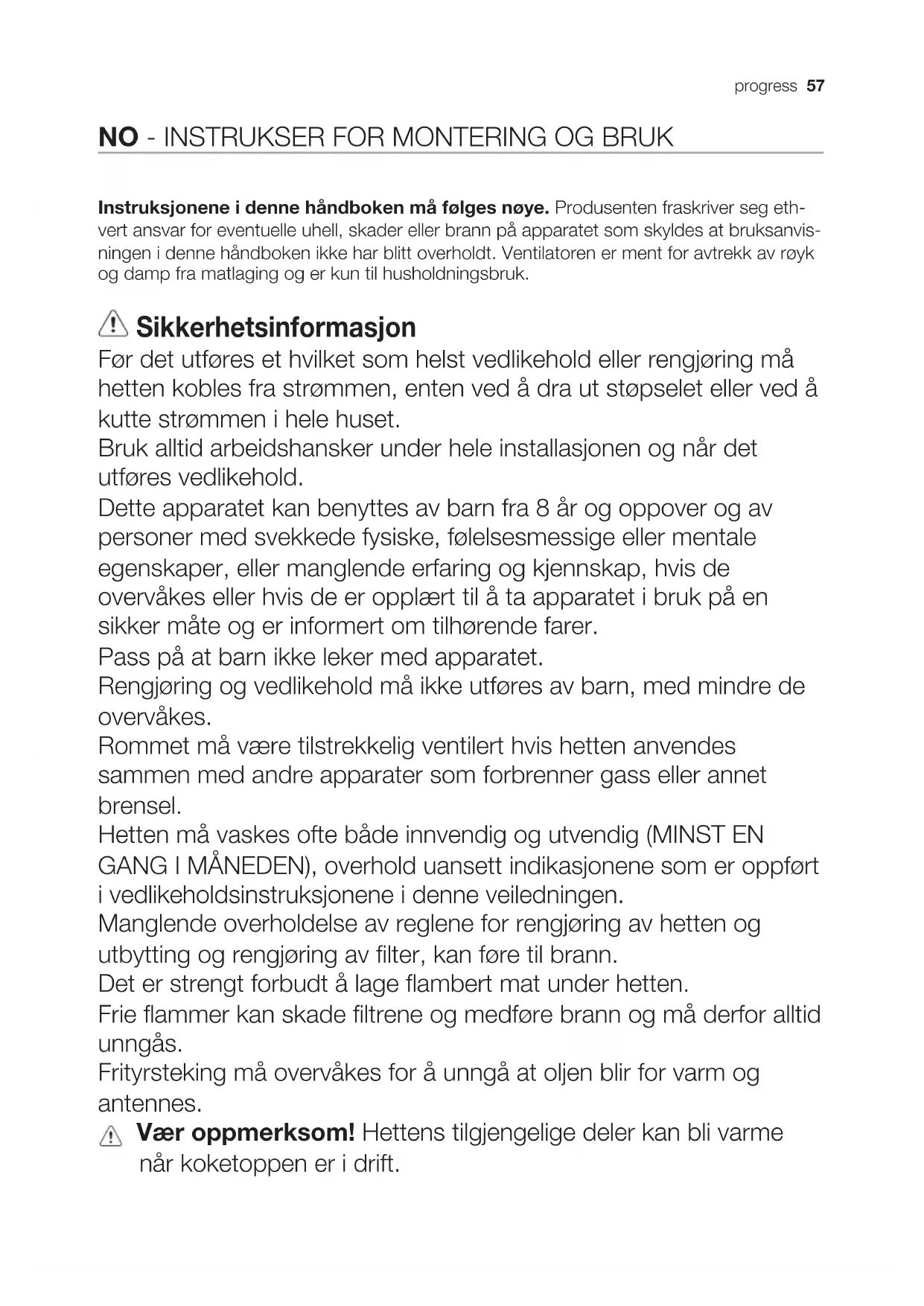 Instruksjonene i dette handboken på fölges nøye. Produsenten fraskriver seg eth-vert ansvar for eventuelle uhell, skader eller brann på apparatet som skyldes at bruksanvisinningen i dette handboken ikke har blitt overholdt. Ventilatoren er ment for avtrekk av røyk og damp fra matlaging og er kun til husholdningsbruk.
