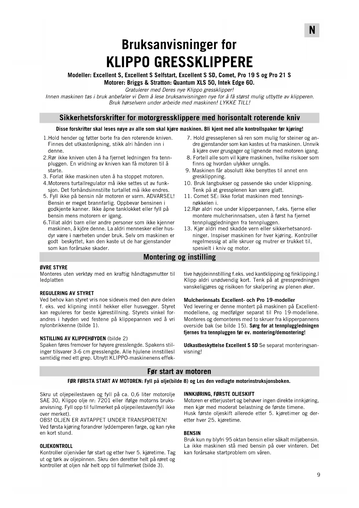 Roger Klotz, Direktør, Klippo AB9 Bruksanvisninger for KLIPPO GRESSKLIPPERE Modeller: Excellent S, Excellent S Selfstart, Excellent S SD, Comet, Pro 19 S og Pro 21 S Motorer: Briggs & Stratton: Quantum XLS 50, Intek Edge 60. Gratulerer med Deres nye Klippo gressklipper!Innen maskinen tas i bruk anbefaler vi Dem å lese bruksanvisningen nye for å få størst mulig utbytte av klipperen.Bruk hørselvern under arbeide med maskinen! LYKKE TILL!Disse forskrifter skal leses nøye av alle som skal kjøre maskinen. Bli kjent med alle kontrollspaker før kjøring!ØVRE STYREMonteres uten verktøy med en kraftig håndtagsmutter tilledplattenREGULERING AV STYRETVed behov kan styret vris noe sideveis med den øvre delenf. eks. ved klipning inntil hekker eller husvegger. Styretkan reguleres for beste kjørestillning. Styrets vinkel for-andres i høyden ved festene på klippepannen ved å vrinylonbrikkenne (bilde 1).NSTILLING AV KLIPPEHØYDEN (bilde 2)Spaken føres fremover for høyere gresslengde. Spakens stil-inger tilsvarer 3-6 cm gresslengde. Alle hjulene innstillesIsamtidig med ett grep. Utnytt KLIPPO-maskinenens effek-tive høyjdeinnstilling f.eks. ved kantklipping og finklipping.lKlipp aldri unødvendig kort. Tenk på at gresspredningenvanskeligjøres og risikoen for skalpering av plenen øker.Mulcherinnsats Excellent- och Pro 19-modellerVed levering er denne montert på maskinen på Excellent-modellene, og medfølger separat til Pro 19-modellene.Monteres og demonteres med to skruer fra klipperpannensoverside bak (se bilde 15). Sørg for at tennpluggledningenfjernes fra tennpluggen før ev. montering/demontering!Udkastbeskyttelse Excellent S SD Se separat monteringsan-visning!Skru ut oljepeilestaven og fyll på ca. 0,6 liter motoroljeSAE 30, Klippo olje nr: 7201 eller ifølge motorns bruks-anvisning. Fyll opp til fullmerket på oljepeilestaven(fyll ikkeover merket).OBS! OLJEN ER AVTAPPET UNDER TRANSPORTEN!Ved førsta kjøring forandrer lyddemperen farge, og kan rykeen kort stund.OLJEKONTROLLKontroller oljenivåer før start og etter hver 5. kjøretime. Tagut og tørk av oljepinnen. Skru den deretter helt på røret ogkontroller at oljen når helt opp til fullmerket (bilde 3).FØR FØRSTA START AV MOTOREN: Fyll på olje(bilde 8) og Les den vedlagte motorinstruksjonsboken. Montering og instilling Før start av motoren