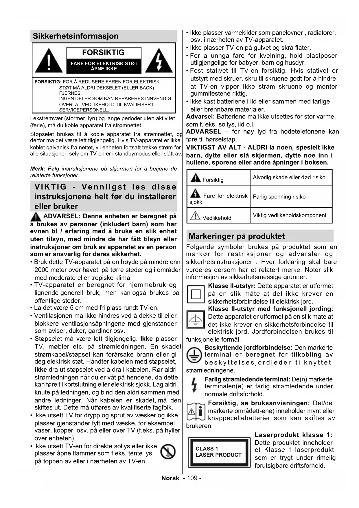 Senderspesikasjoner for trådløs LAN(**) .......... 114Norsk - 109 - Sikkerhetsinformasjon FORSIKTIG FARE FOR ELEKTRISK STØTÅPNE IKKEFORSIKTIG: FOR Å REDUSERE FAREN FOR ELEKTRISK STØT MÅ ALDRI DEKSELET (ELLER BACK) FJERNES. INGEN DELER SOM KAN REPARERES INNVENDIG. OVERLAT VEDLIKEHOLD TIL KVALIFISERT SERVICEPERSONELL. Merk: Følg instruksjonene på skjermen for å betjene de relaterte funksjoner. I ekstremvær (stormer, lyn) og lange perioder uten aktivitet (ferie), må du koble apparatet fra strømnettet. Støpselet brukes til å koble apparatet fra strømnettet, og derfor må det være lett tilgjengelig. Hvis TV-apparatet er ikke koblet galvanisk fra nettet, vil enheten fortsatt trekke strøm for alle situasjoner, selv om TV-en er i standbymodus eller slått av. VIKTIG - Vennligst les disse instruksjonene helt før du installerer eller bruker ADVARSEL: Denne enheten er beregnet på å brukes av personer (inkludert barn) som har evnen til / erfaring med å bruke en slik enhet uten tilsyn, med mindre de har fått tilsyn eller instruksjoner om bruk av apparatet av en person som er ansvarlig for deres sikkerhet.