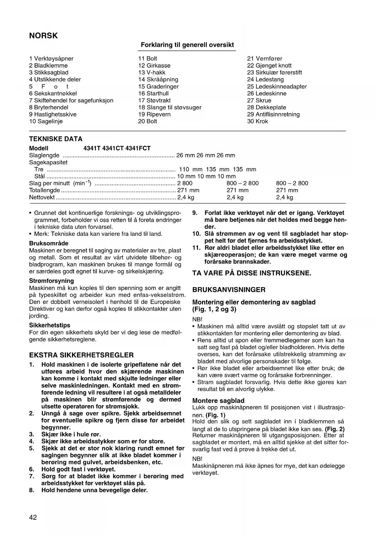 - Maskinen må alltid vare avslätt og stoppslet tatt ut av stikkontakten for montering eller demontering av blad.
