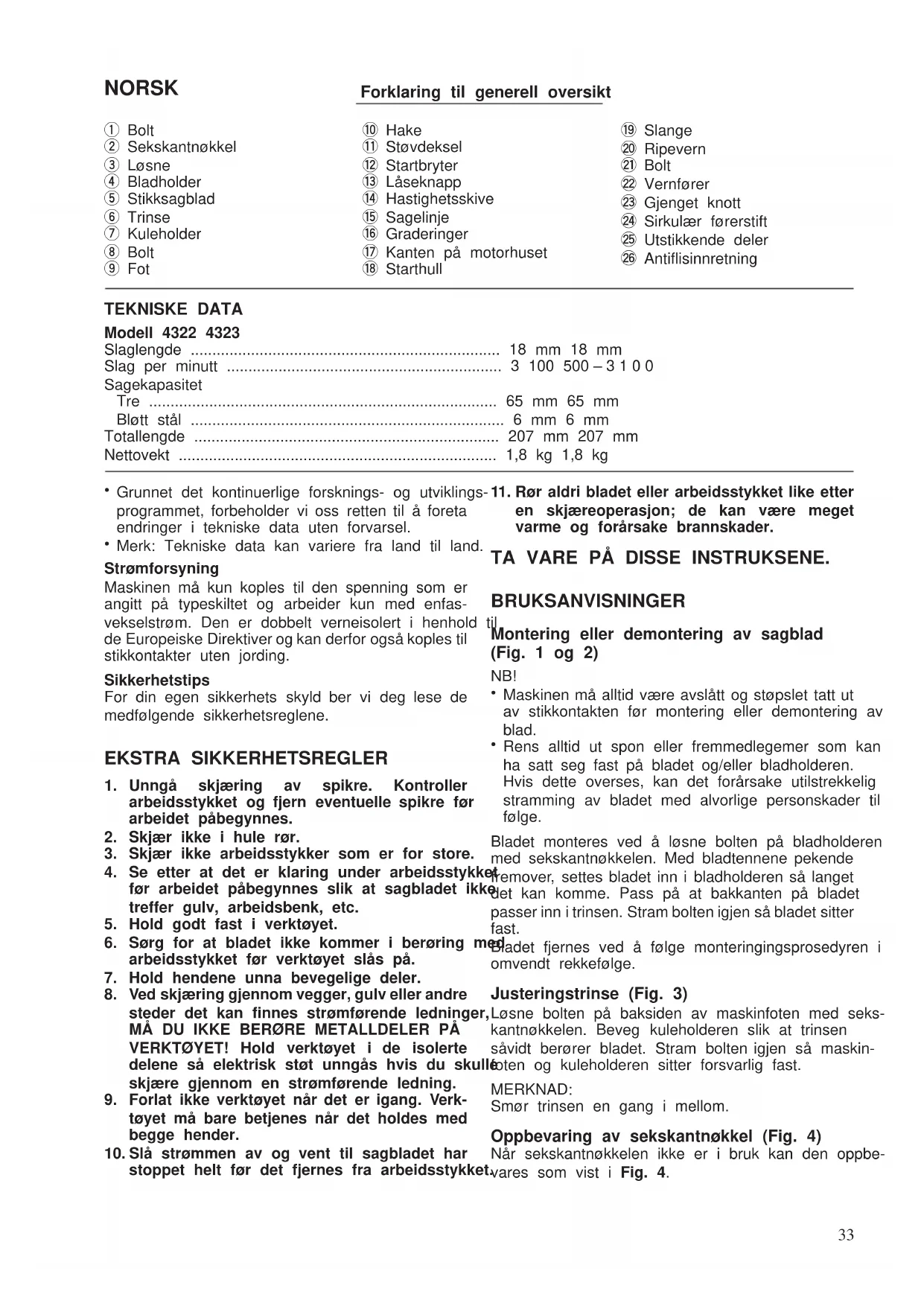 Rens alltid ut spon eller fremmedlegemer som kan ha satt seg fast på bladet og/eller bladholderen. Hvis dette overses, kan det forårsake utilstrekkelig stramming av bladet med alvorlige personskader til følge. Bladet monteres ved å løsne bolten på bladholderen med sekskantnøkkelen. Med bladtennene pekende fremover, settes bladet inn i bladholderen så langet det kan komme. Pass på at bakkanten på bladet passer inn i trinsen. Stram bolten igjen så bladet sitter fast. Bladet fjernes ved å følge monteringingsprosedyren i omvendt rekkefølge. Justeringstrinse (Fig. 3) Løsne bolten på baksiden av maskinfoten med seks- kantnøkkelen. Beveg kuleholderen slik at trinsen såvidt berører bladet. Stram bolten igjen så maskin- foten og kuleholderen sitter forsvarlig fast. MERKNAD: Smør trinsen en gang i mellom. Oppbevaring av sekskantnøkkel (Fig. 4) Når sekskantnøkkelen ikke er i bruk kan den oppbe- vares som vist i Fig. 4. 4322/4323 (Nor) (’98. 5. 6) 33Støvdeksel (Fig. 5) NB! Bruk alltid vernebriller når arbeidet foregår med sen- ket støvdeksel. Senk støvdekslet for å unngå at sagspon spres omkring. Støvdekslet må imidlertid løftes helt opp under skråskjæring. Bryter (Fig. 6) NB! Før støpslet settes i stikkontakten må det sjekkes at bryteren fungerer som den skal og går tilbake til ‘‘OFF’’ når den slippes. Maskinen startes ved å klemme inn startbryteren. Slipp bryteren for å stoppe. Når kontinuerlig drift er ønskelig, klem inn bryteren og trykk på låseknappen. Den låste posisjonen frigjøres ved klemme startbry- teren helt inn og så slippe den. Hastighetsskive (Fig. 7) Gjelder kun modell 4323 Maskinens hastighet kan justeres trinnløst mellom til 500 og 3 100 slag per minutt ved å dreie på hastighetsskiven. Hastigheten øker når skiven dreies mot 6-tallet; og den blir lavere når skiven dreies mot 1-tallet. Se tabellen under for å finne riktig hastighet til emnet som skal sages. Men korrekt hastighet kan variere avhengig av typen eller tykkelsen på emnet. Generelt vil høyere hastighet gi raskere saging, men bladet slites også hurtigere ned. Arbeidsemne som skal sages Tall på hastighetsskiven Tre 5–6 Bløtt stål 3 – 6 Rustfritt stål 3 – 4 Aluminium 3 – 6 Plast 1 – 4 NB! Hastighetsskiven kan bare dreies til 6 og tilbake til 1. Den må ikke forseres forbi 6 eller 1, det kan ødelegge hele funksjonen for justering av hastighet. Bruk (Fig. 8) NB! Maskinen må holdes vinkelrett på materialet ellers kan bladet brekke og forårsake alvorlige person- skader. Slå maskinen på og vent til bladet oppnår full hastighet. La deretter maskinfoten hvile flatt på mate- rialet og beveg maskinen forsiktig fremover langs den opptegnede sagelinjen. Ved saging av kurver, må maskinen beveges meget langsomt. Skråskjæring NB!