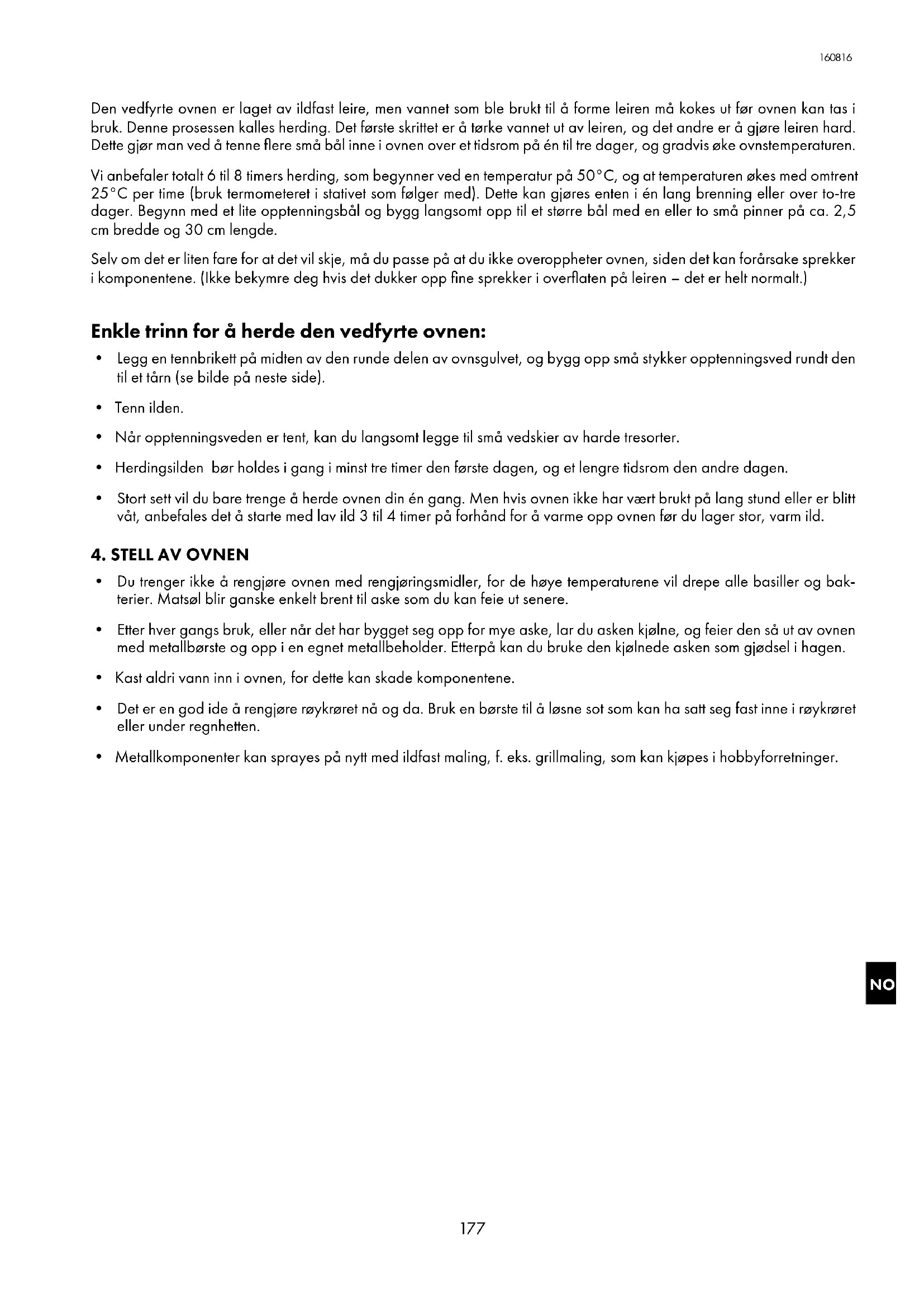 Den vedfyrte ovnen er laget av ildfast leire, men vannet som ble brukt til å forme leiren må kokes ut før ovnen kan tas i bruk Denne prosessen kalles herding Det første skrittet er å tørke vannet ut av leiren, og det andre er å gjøre leiren hard Dette gjør man ved å tenne flere små bål inne i ovnen over et tidsrom på én til tre dager, og gradvis øke ovnstemperaturen Vi anbefaler totalt 6 til 8 timers herding, som begynner ved en temperatur på 50°C, og at temperaturen økes med omtrent 25°C per time (bruk termometeret i stativet som følger med) Dette kan gjøres enten i én lang brenning eller over to-tre dager Begynn med et lite opptenningsbål og bygg langsomt opp til et større bål med en eller to små pinner på ca 2,5 cm bredde og 30 cm lengde Selv om det er liten fare for at det vil skje, må du passe på at du ikke overoppheter ovnen, siden det kan forårsake sprekker i komponentene (Ikke bekymre deg hvis det dukker opp fine sprekker i overflaten på leiren – det er helt normalt) Enkle trinn for å herde den vedfyrte ovnen: