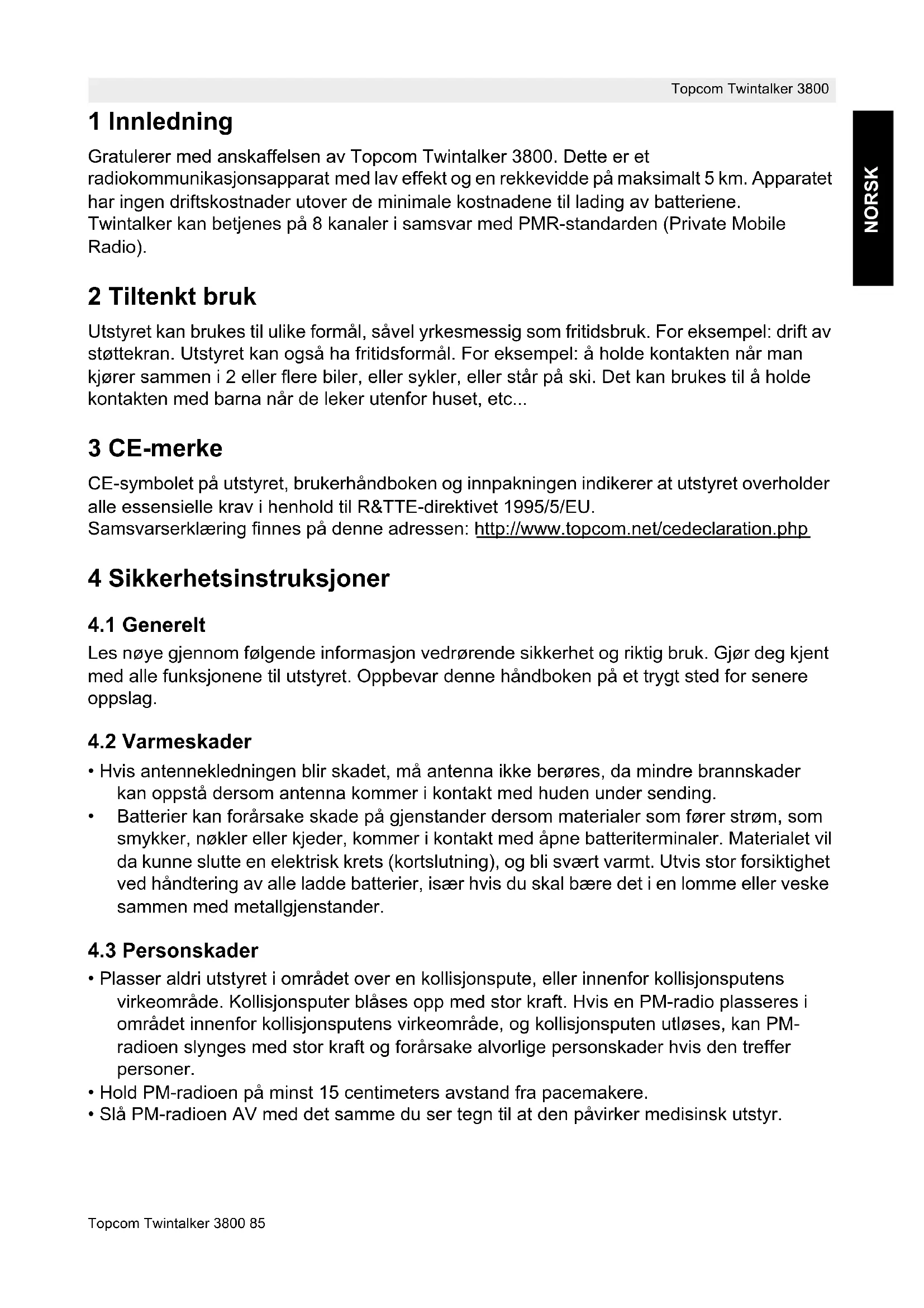 - Hvis enheten blir våt, må du straks slå den av og fjerne batteriene. Tørk ut batterirommet med en myk og tørr klut for å minimalisere faren for vannskade. La dekselet over batterirommet være av over natten, eller til utstyret er fullstendig tørt. Inne bruk enheten før den er fullstendig tørket. Miljøer med potensielt eksplosive gasser tilstede er ofte klart merket, men ikke alltid. Slike områder inkluderer drivstoffpåfyllingssteder som under dekket på båter; steder hvor drivstoff oppbevares eller overfylles; områder hvor luften inneholder kjemikalier eller partikler, som støv, korn eller metallstøv; samt ethvert område der du normalt ville bli bedt om å slå av bilmotoren.Topcom Twintalker 3800 87 Topcom Twintalker 3800 NORSK 6 Avhending av produktet (miljø) Når produktet skal kasseres, må du ikke kaste det sammen med vanlig husholdningsavfall, men levere det til et innsamlingssted for resirkulering av elektrisk og elektronisk utstyr. Symbolet på produktet, bruksanvisningen og/eller boksen angir dette. Noen av produktets materialer kan brukes om igjen hvis du tar produktet med til et innsamlingspunkt for resirkulering. Ved å sørge for at deler eller råmateriale fra brukte produkter kan brukes om igjen, bidrar du til å ta vare på miljøet. Ta kontakt med de lokale myndighetene hvis du trenger mer informasjon om innsamlingspunkter i ditt område. 7 Bruke en personlig mobilradioenhet For at PM-radioer skal kunne kommunisere, må de være innstilt på samme kanal og CTCSS- kode, og innen rekkevidde av hverandre (opptil 5 km i åpent lende). Ettersom disse enhetene bruker ledige frekvensbånd (kanaler) må alle enhetene som brukes dele på disse kanalene (totalt 8 kanaler). Derfor kan ingen avlyttingsgaranti gis. Alle med en PM-radio innstilt på den samme kanalen, kan overhøre konversasjonen. Når du ønsker å kommunisere (sende et talesignal), må du trykke på -knappen . Når knappen er trykket inn, vil enheten gå i sendemodus, og du kan avsi meldingen din gjennom mikrofonen. Alle andre PM-radioer innenfor rekkevidde, innstilt på den samme kanalen og i beredskapsmodus (sender ikke), vil høre meldingen din. Du må vente til den andre parten slutter å sende før du kan svare på meldingen. Ved slutten av hver sending vil enheten sende en pipetone hvis Roger-tone er aktivert (se kapittel 14.10). For å svare trykker du bare på -knappen og snakker inn i mikrofonen. 8 Inkludert i pakningen