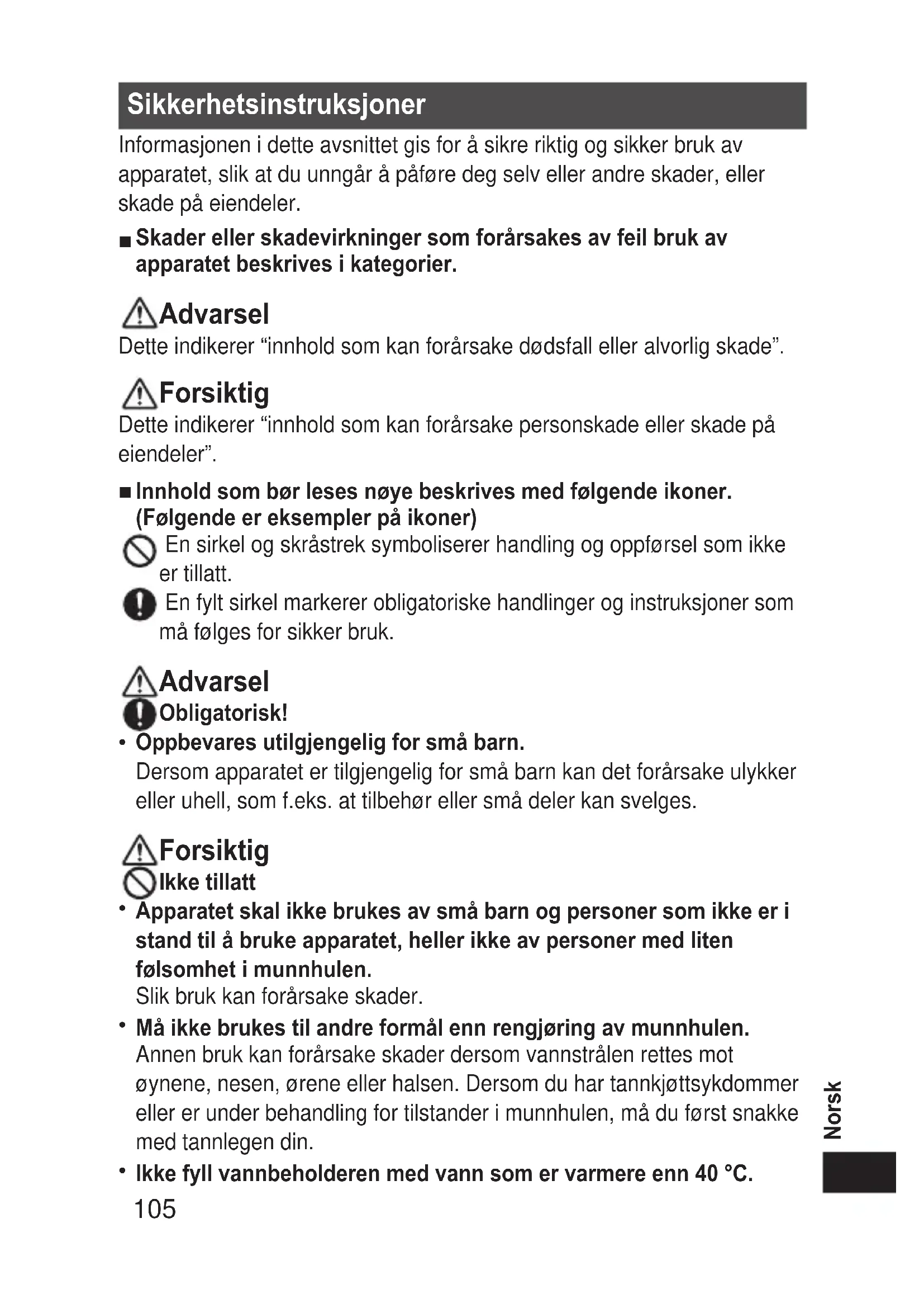 - 106 Norsk Dette kan forårsake brannskader. Obligatorisk! Holdapparatetrent,ogbrukfrisktspringvannellervarmtvannnår durengjørmunnen. Nårduerferdigåbrukeapparatet,mådusørgeforåtømmeut restenavvannetivannbeholderen,ogkjøreapparateti2til3 sekunderforåtømmedetheltforvannrester. Dersom apparatet brukes uten korrekt rengjøring, kan det føre til helseskader på grunn av dannelse av mugg og bakterier. Dette kan også føre til dårlig lukt og at apparatet ikke fungerer som det skal. Lesadvarselensomstårpåbatteriene. Kontroller(+)-og(-)-polenepåbatteriene,ogsettdemiriktigvei. Deponerbruktebatterierpåkorrektmåte. Tabatterieneutavapparatetdersomdetikkeskalbrukespåen langperiode. Brukbatterieneinnenanbefaltholdbarhetsdato. Dersom de brukes etter anbefalt holdbarhetsdato, kan batteriene bli overopphetet eller eksplodere, og forårsake skade eller forurensning på omgivelsene på grunn av batterisyrelekkasje. Måikkedemonteres! Aldriforetaendringerpåapparatet.Dumåhellerikkedemontere ellerrepareredet. Dette kan forårsake brann, elektrisk støt eller skader. Forsiktig Dette apparatet er ikke beregnet på bruk av personer (inklusive barn) med nedsatte sanser, fysiske eller mentale evner, eller med manglende erfaring og kunnskap, dersom de ikke får tilsyn eller veiledning angående bruk av apparatet av en person som er ansvarlig for deres sikkerhet. Barn bør ha tilsyn for å sikre at de ikke leker med apparatet.