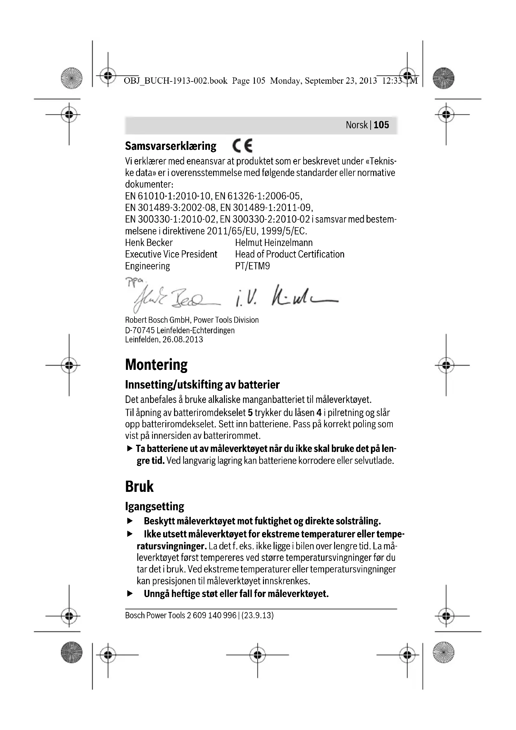 - Avhengig av materialet og og størrelsen på objektene, samt materialet i og tilstanden til underlaget (vegger, tak, gulv) ** mindre registreringsdybde ved ikke-spenningsførende ledninger Måleresultatet kan bli mindre nøyaktig og måledybden kan reduseres hvis un- derlagets tilstand er ugunstig. OBJ_BUCH-1913-002.book Page 104 Monday, September 23, 2013 12:33 PMNorsk | 105 Bosch Power Tools 2 609 140 996 | (23.9.13) Samsvarserklæring Vi erklærer med eneansvar at produktet som er beskrevet under «Teknis- ke data» er i overensstemmelse med følgende standarder eller normative dokumenter: EN 61010-1:2010-10, EN 61326-1:2006-05, EN 301489-3:2002-08, EN 301489-1:2011-09, EN 300330-1:2010-02, EN 300330-2:2010-02 i samsvar med bestem- melsene i direktivene 2011/65/EU, 1999/5/EC. Robert Bosch GmbH, Power Tools Division D-70745 Leinfelden-Echterdingen Leinfelden, 26.08.2013 Montering Innsetting/utskifting av batterier Det anbefales å bruke alkaliske manganbatteriet til måleverktøyet. Til åpning av batteriromdekselet 5 trykker du låsen 4 i pilretning og slår opp batteriromdekselet. Sett inn batteriene. Pass på korrekt poling som vist på innersiden av batterirommet. Ta batteriene ut av måleverktøyet når du ikke skal bruke det på len- gre tid. Ved langvarig lagring kan batteriene korrodere eller selvutlade. Bruk Igangsetting Beskytt måleverktøyet mot fuktighet og direkte solstråling. Ikke utsett måleverktøyet for ekstreme temperaturer eller tempe- ratursvingninger. La det f. eks. ikke ligge i bilen over lengre tid. La må- leverktøyet først tempereres ved større temperatursvingninger før du tar det i bruk. Ved ekstreme temperaturer eller temperatursvingninger kan presisjonen til måleverktøyet innskrenkes. Unngå heftige støt eller fall for måleverktøyet. Henk Becker Executive Vice President Engineering Helmut Heinzelmann Head of Product Certification PT/ETM9 OBJ_BUCH-1913-002.book Page 105 Monday, September 23, 2013 12:33 PM106 | Norsk 2 609 140 996 | (23.9.13) Bosch Power Tools Inn-/utkobling Før måleverktøyet innkobles må du passe på at sensorområdet 6 ikke er fuktig. Gni måleverktøyet eventuelt tørt med en klut. For å slå på måleverktøyet skyver du av/på-bryteren 3 ned. Etter en kort selvtest er måleverktøyet klart til bruk. Driftsberedskapen vi- ses ved at signallampen 2 lyser. Hvis signallampen 2 ikke lyser etter at må- leverktøyet har blitt slått på, må batteriene skiftes ut. For å slå av måleverktøyet skyver du av/på-bryteren 3 opp. Etter ca. 10 min uten utførelse av en måling kobles måleverktøyet auto- matisk ut for å skåne batteriene. Merk: Hvis måleverktøyet har slått seg av automatisk, er av/på-bryteren 3 fortsatt i stillingen «På». For å slå på måleverktøyet igjen skyver du av/på-bryteren 3 først til stillingen «Av» og deretter til «På» igjen. Driftstyper Måleverktøyet detekterer objekter under sensorområdet 6. Før du borer, sager eller freser i en vegg, bør du utelukke farer ved hjelp av andre informasjonskilder. Ettersom måleverktøyets nøyaktig- het og måledybden kan reduseres av forhold i omgivelsene eller veggens tilstand, er det fare for at det finnes objekter i sensorområdet selv om verktøyets indikator ikke viser noe objekt (signallampen 2 lyser grønt). Signallampe Forklaring Grønn Ingen objekter funnet Gul – Metallobjekt i nærheten av sensoren – Lite eller dyptliggende metallobjekt i sensorområdet eller – Påvirkning av sensoren på grunn av ugunstig tilstand på veggen Rødt og kontinuerlig lyd Metallobjekt funnet i sensorområdet Rødt blinkende (raskt) lys og pulserende lyd Spenningsførende ledning funnet OBJ_BUCH-1913-002.book Page 106 Monday, September 23, 2013 12:33 PMNorsk | 107 Bosch Power Tools 2 609 140 996 | (23.9.13) Søking av metallobjekter Etter innkoblingen lyser signallampen 2 grønt. Sett måleverktøyet på overflaten som skal undersøkes, og beveg det til si- den. – Hvis det ikke kan registreres noe metallobjekt i underlaget, fortsetter signallampen 2 å lyse grønt, og det utløses ikke noe lydsignal. – Hvis måleverktøyet nærmer seg et metallobjekt, lyser signallampen 2 først gult, og skifter til rødt når det kommer nærmere metallobjektet. Så snart signallampen lyser rødt, utløses i tillegg et lydsignal, og tone- høyden til signalet stiger etter hvert som verktøyet nærmer seg metall- objektet. – Over et metallobjekt lyser signallampen 2 rødt, og det utløses et lydsig- nal med maksimal tonehøyde. Også når signallampen 2 lyser gult kan det befinne seg et metall- objekt under sensorområdet. Små eller dyptliggende metallobjekter befinner seg i nærheten av sensoren, eller tilstanden til veggen svekker måleresultatet. Første gang metallobjektet passeres, vises objektets plassering bare omtrentlig. Hvis du beveger måleverk- tøyet over metallobjektet flere ganger, blir objektregis- treringen mr nøyaktig for hver gang. Etter at du har be- veget måleverktøyet over objektet flere ganger (uten å løfte måleverktøyet fra underlaget), kan metallobjek- tets plassering vises nøyaktig: Hvis signallampen 2 ly- ser rødt og lydsignalet utløses, ligger metallobjektet under sensorområdet. Når lydsignalets tonehøyde er høyest, befinner metallobjektet seg under midten av sensoren. Søking av spenningsførende ledninger Måleverktøyet viser ledninger som fører spenning mellom 110 V og 240 V og som har frekvens i overensstemmelse med den vanlige standarden (vekselstrøm med 50 hhv. 60 Hz). Andre ledninger (likestrøm, høyere/ lavere frekvens eller spenning) og ledninger som ikke er spenningsføren- de, kan ikke påvises sikkert, men også slike kan eventuelt vises som me- tallobjekter. Søk etter spenningsførende ledninger skjer automatisk ved hver måling. Hvis en spenningsførende ledning blir funnet, blinker signallampen 2 rødt, og det utløses et pulserende lydsignal med rask tonesekvens. Beveg OBJ_BUCH-1913-002.book Page 107