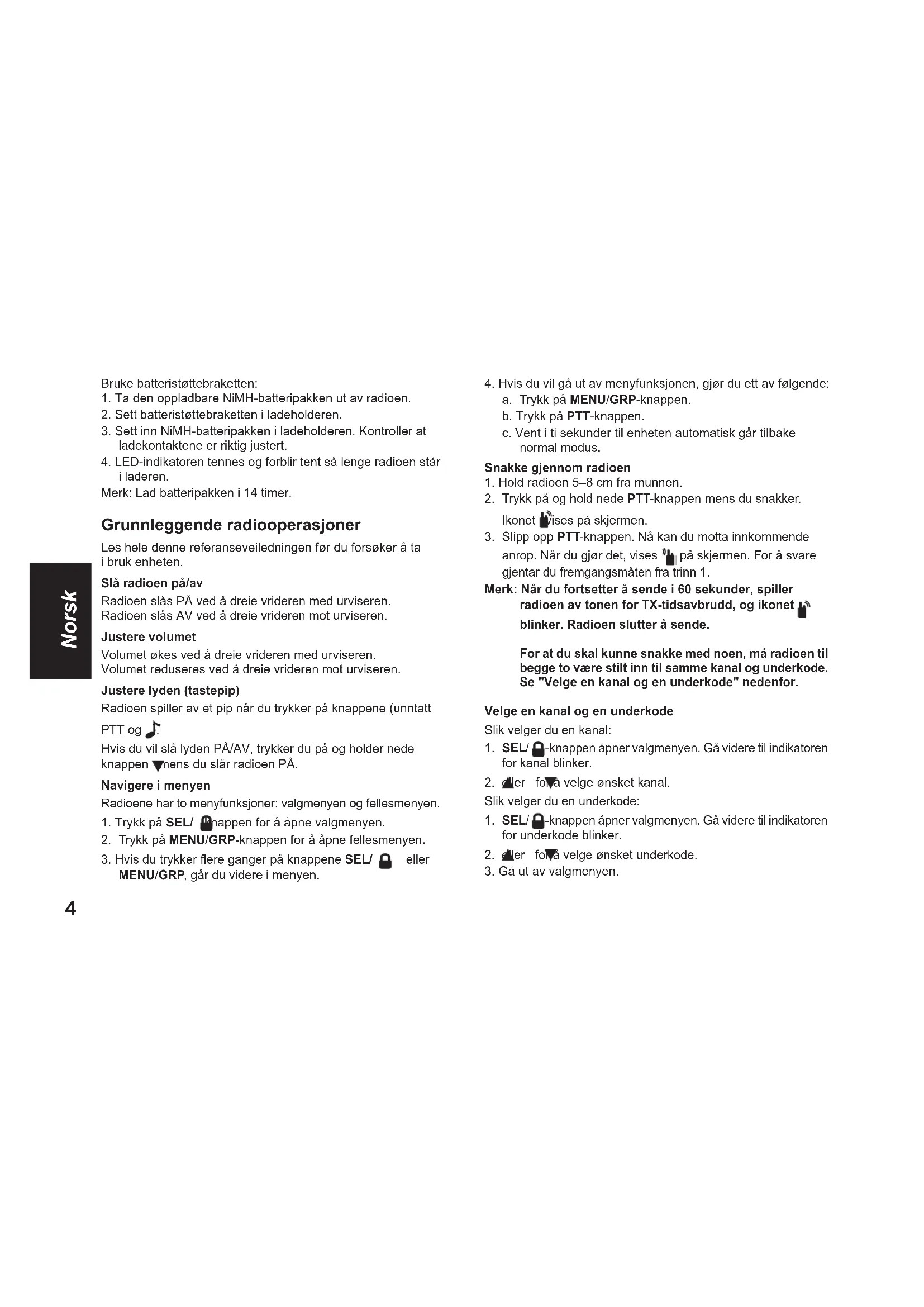 anrop. Når du gjør det, vises på skjermen. For å svare gjentar du fremgangsmåten fra trinn 1. Merk: Når du fortsetter å sende i 60 sekunder, spiller radioen av tonen for TX-tidsavbrudd, og ikonet blinker. Radioen slutter å sende. For at du skal kunne snakke med noen, må radioen til begge to være stilt inn til samme kanal og underkode. Se "Velge en kanal og en underkode" nedenfor. Velge en kanal og en underkode Slik velger du en kanal:
