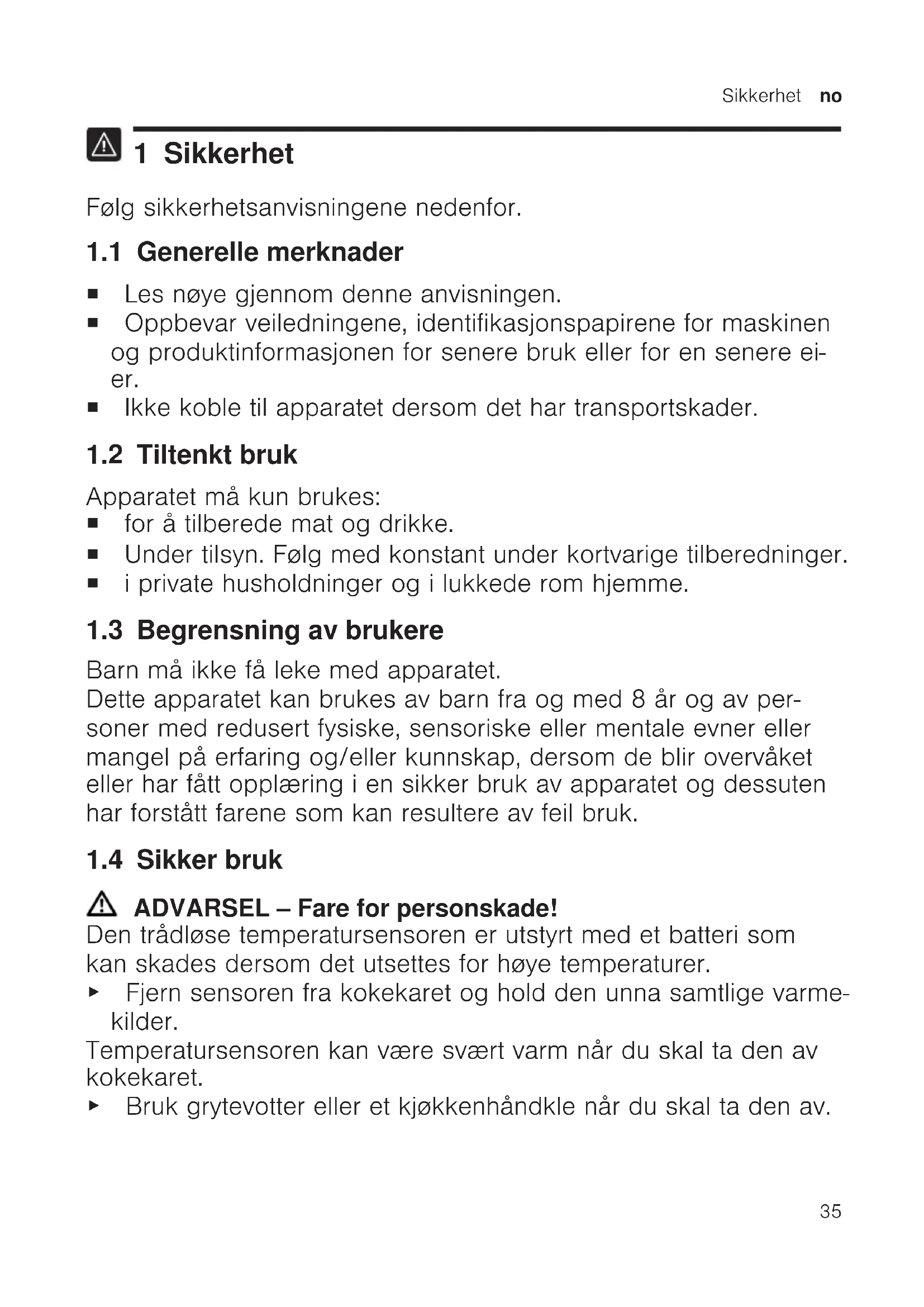 1 Sikkerhet Følg sikkerhetsanvisningene nedenfor. 1.1 Generelle merknader ¡ Les nøye gjennom denne anvisningen. ¡ Oppbevar veiledningene, identifikasjonspapirene for maskinen og produktinformasjonen for senere bruk eller for en senere ei- er. ¡ Ikke koble til apparatet dersom det har transportskader. 1.2 Tiltenkt bruk Apparatet må kun brukes: ¡ for å tilberede mat og drikke. ¡ Under tilsyn. Følg med konstant under kortvarige tilberedninger. ¡ i private husholdninger og i lukkede rom hjemme. 1.3 Begrensning av brukere Barn må ikke få leke med apparatet. Dette apparatet kan brukes av barn fra og med 8 år og av per- soner med redusert fysiske, sensoriske eller mentale evner eller mangel på erfaring og/eller kunnskap, dersom de blir overvåket eller har fått opplæring i en sikker bruk av apparatet og dessuten har forstått farene som kan resultere av feil bruk. 1.4 Sikker bruk ADVARSEL‒Fare for personskade! Den trådløse temperatursensoren er utstyrt med et batteri som kan skades dersom det utsettes for høye temperaturer. ▶ Fjern sensoren fra kokekaret og hold den unna samtlige varme- kilder. Temperatursensoren kan være svært varm når du skal ta den av kokekaret. ▶ Bruk grytevotter eller et kjøkkenhåndkle når du skal ta den av.no Sikkerhet