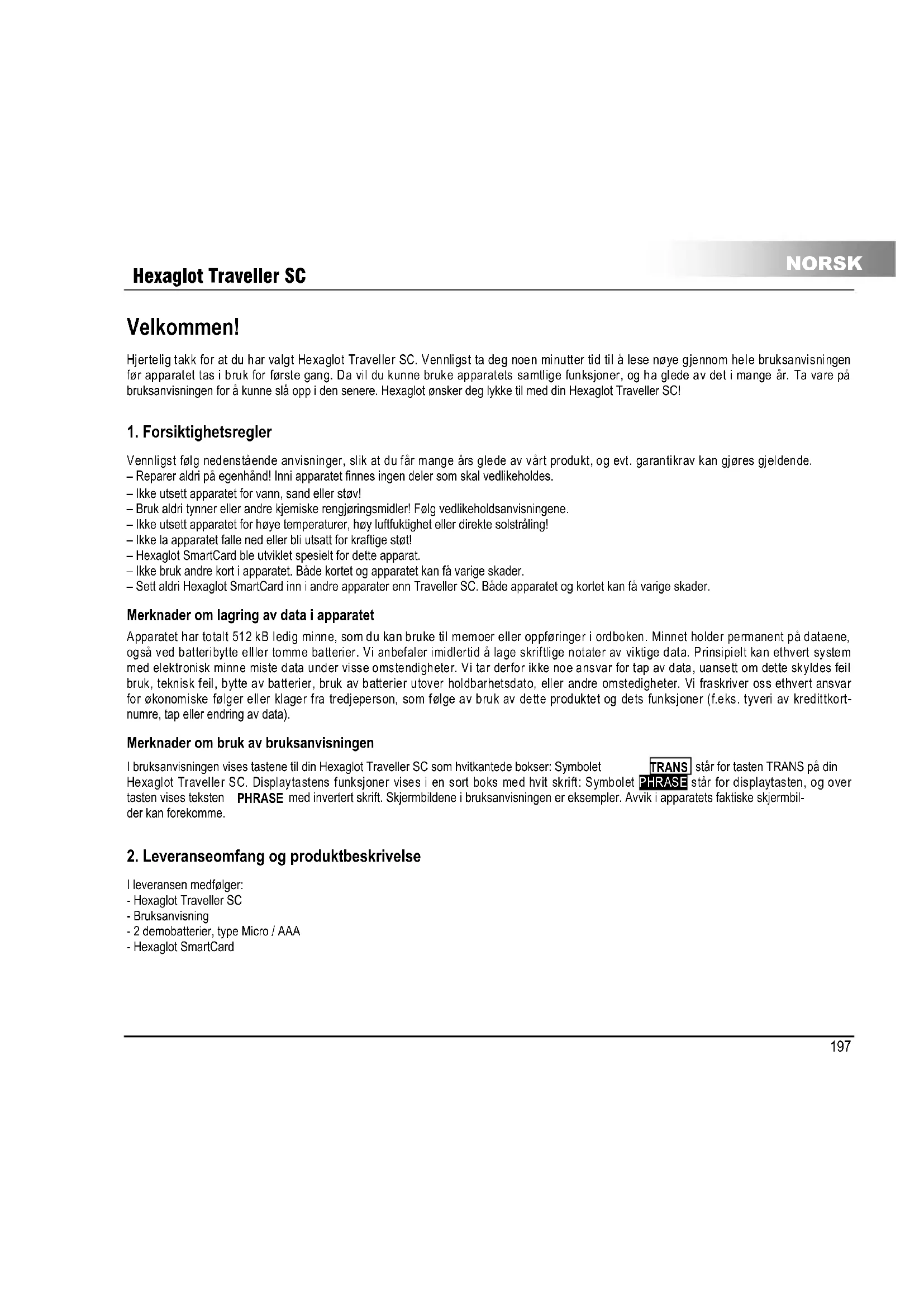 NORSK Velkommen! Hjertelig takk for at du har valgt Hexaglot Traveller SC. Vennligst ta deg noen minutter tid til å lese nøye gjennom hele bruksanvisningen før apparatet tas i bruk for første gang. Da vil du kunne bruke apparatets samtlige funksjoner, og ha glede av det i mange år. Ta vare på bruksanvisningen for å kunne slå opp i den senere. Hexaglot ønsker deg lykke til med din Hexaglot Traveller SC!