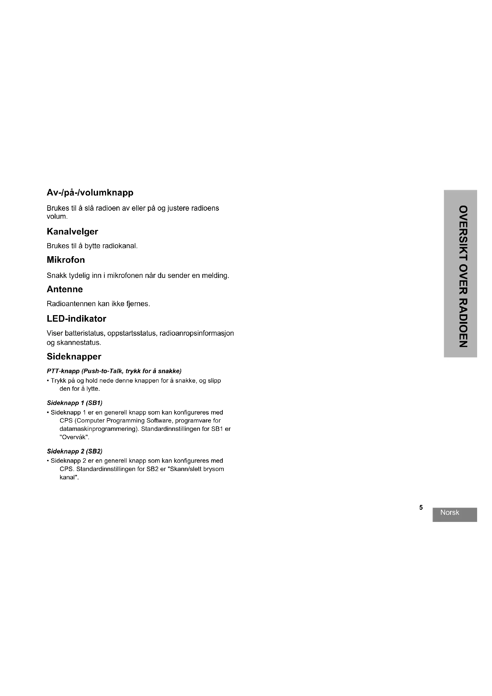 Tilbakestille til standardinnstillinger Tilbakestilling til standardinnstillinger gjenoppretter alle radiofunksjonene til opprinnelige fabrikkinnstillinger. Hvis du vil gjøre dette, trykker du på PTT-, SB1- og SB2- knappen samtidig mens du slår på radioen, og holder dem nede til du hører en høy sprakelyd.Norsk