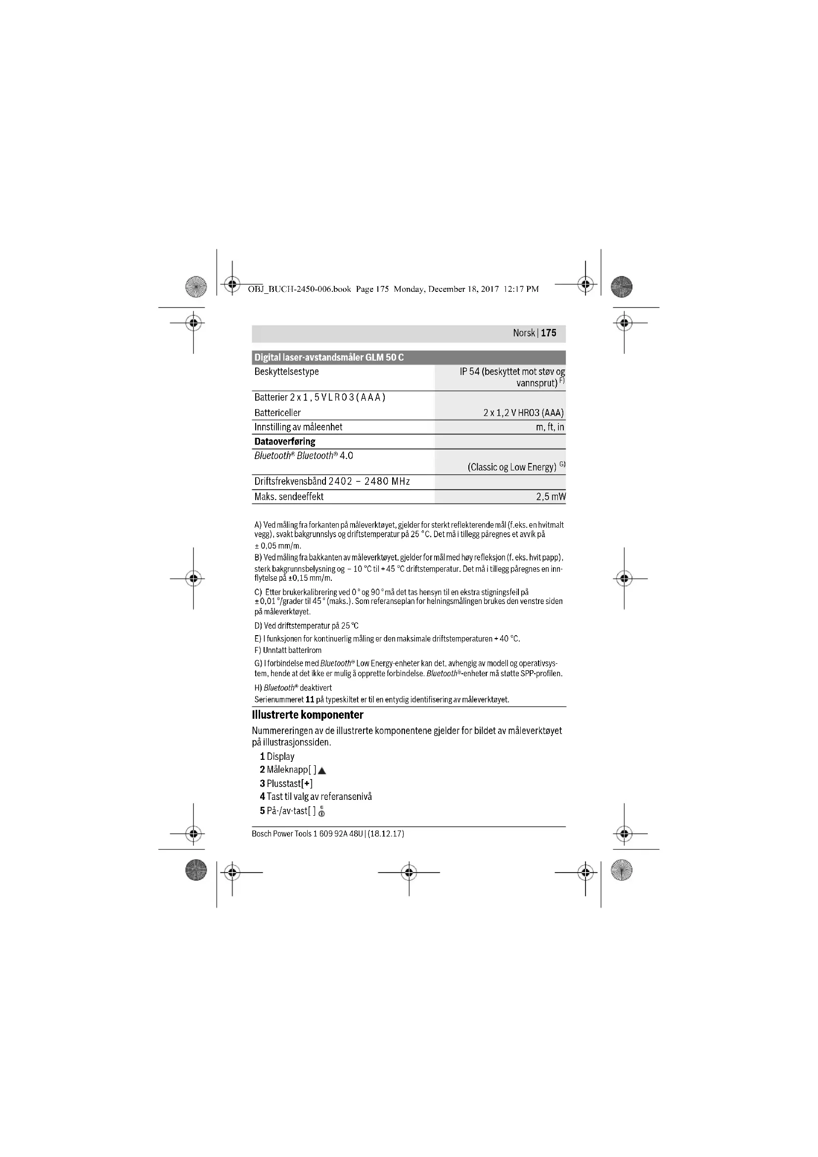 Driftsfrekvensbånd 2402 – 2480 MHz Maks. sendeeffekt 2,5 mW A) Ved måling fra forkanten på måleverktøyet, gjelder for sterkt reflekterende mål (f.eks. en hvitmalt vegg), svakt bakgrunnslys og driftstemperatur på 25 °C. Det må i tillegg påregnes et avvik på ± 0,05 mm/m. B) Ved måling fra bakkanten av måleverktøyet, gjelder for mål med høy refleksjon (f. eks. hvit papp), sterk bakgrunnsbelysning og – 10 °C til +45 °C driftstemperatur. Det må i tillegg påregnes en inn- flytelse på ±0,15 mm/m. C) Etter brukerkalibrering ved 0 ° og 90 ° må det tas hensyn til en ekstra stigningsfeil på ±0,01 °/grader til 45 ° (maks.). Som referanseplan for helningsmålingen brukes den venstre siden på måleverktøyet. D) Ved driftstemperatur på 25 °C E) I funksjonen for kontinuerlig måling er den maksimale driftstemperaturen +40 °C. F) Unntatt batterirom G) I forbindelse med Bluetooth® Low Energy-enheter kan det, avhengig av modell og operativsys- tem, hende at det ikke er mulig å opprette forbindelse. Bluetooth®-enheter må støtte SPP-profilen. H) Bluetooth® deaktivert Serienummeret 11 på typeskiltet er til en entydig identifisering av måleverktøyet. Digital laser-avstandsmåler GLM 50 C OBJ_BUCH-2450-006.book Page 175 Monday, December 18, 2017 12:17 PM176 | Norsk 1 609 92A 48U | (18.12.17) Bosch Power Tools 6 Bluetooth®-knapp 7 Funksjonsknapp[Func] 8 Minustast[–] 9 Deksel til batterirom 10 Låsing av batteridekselet 11 Serienummer 12 Laser-advarselsskilt 13 1/4"-stativgjenger 14 Mottakerlinse 15 Utgang laserstråling 16 Beskyttelsesveske 17 Laser-målplate* 18 Laserbriller* 19 Stativ*