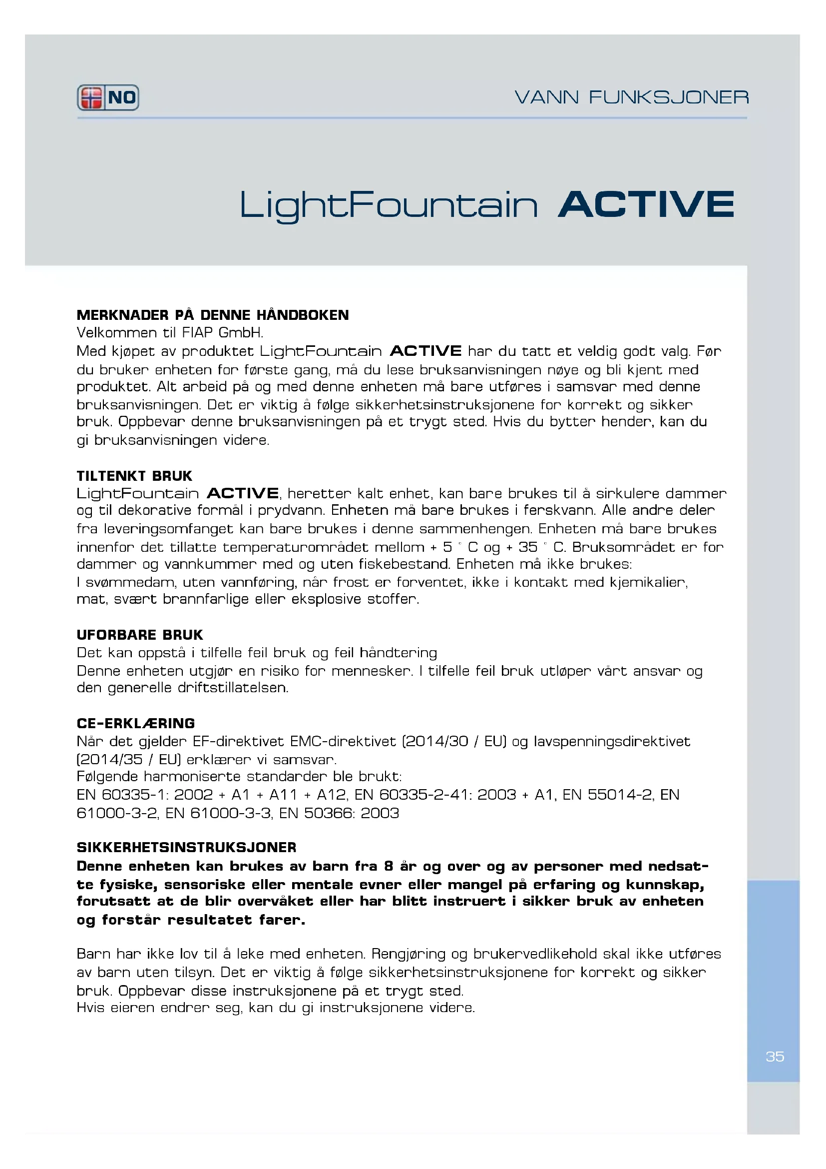 Med kjøpet av produktet LightFountain ACTIVE har du tatt et veldig godt valg. Før du bruker enheten for første gang, må du lese bruksanvisningen nøye og bli kjent med produktet. Alt arbeid på og med denne enheten må bare utføres i samsvar med denne bruksanvisningen. Det er viktig å følge sikkerhetsinstruksjonene for korrekt og sikker bruk. Oppbevar denne bruksanvisningen på et trygt sted. Hvis du bytter hender, kan du gi bruksanvisningen videre.