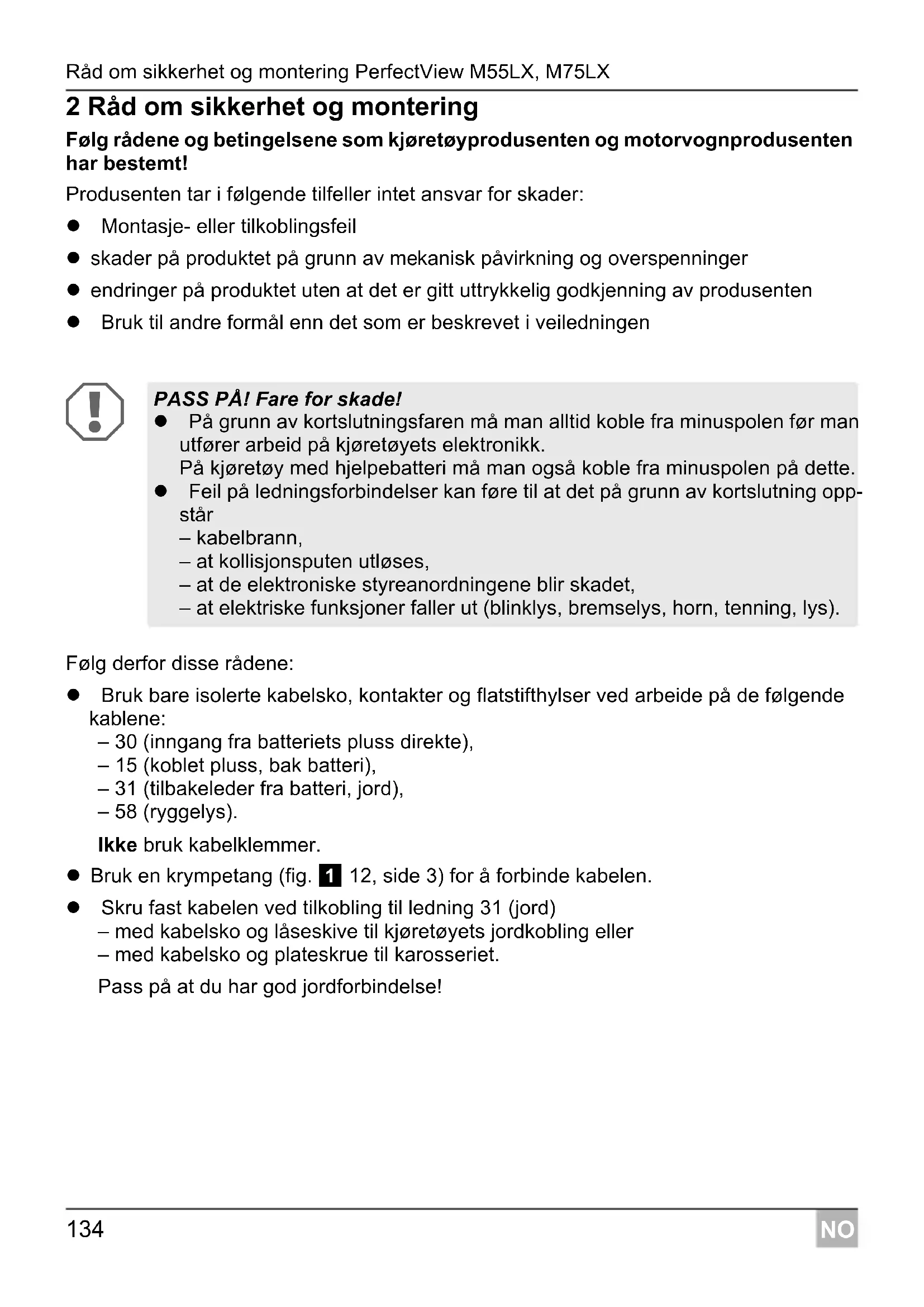 Følg derfor disse rådene: Bruk bare isolerte kabelsko, kontakter og flatstifthylser ved arbeide på de følgende kablene: – 30 (inngang fra batteriets pluss direkte), – 15 (koblet pluss, bak batteri), – 31 (tilbakeleder fra batteri, jord), – 58 (ryggelys). Ikke bruk kabelklemmer. Bruk en krympetang (fig. 1 12, side 3) for å forbinde kabelen. Skru fast kabelen ved tilkobling til ledning 31 (jord) – med kabelsko og låseskive til kjøretøyets jordkobling eller – med kabelsko og plateskrue til karosseriet. Pass på at du har god jordforbindelse! PASS PÅ! Fare for skade! På grunn av kortslutningsfaren må man alltid koble fra minuspolen før man utfører arbeid på kjøretøyets elektronikk. På kjøretøy med hjelpebatteri må man også koble fra minuspolen på dette. Feil på ledningsforbindelser kan føre til at det på grunn av kortslutning opp- står – kabelbrann, – at kollisjonsputen utløses, – at de elektroniske styreanordningene blir skadet, – at elektriske funksjoner faller ut (blinklys, bremselys, horn, tenning, lys).PerfectView M55LX, M75LX Råd om sikkerhet og montering