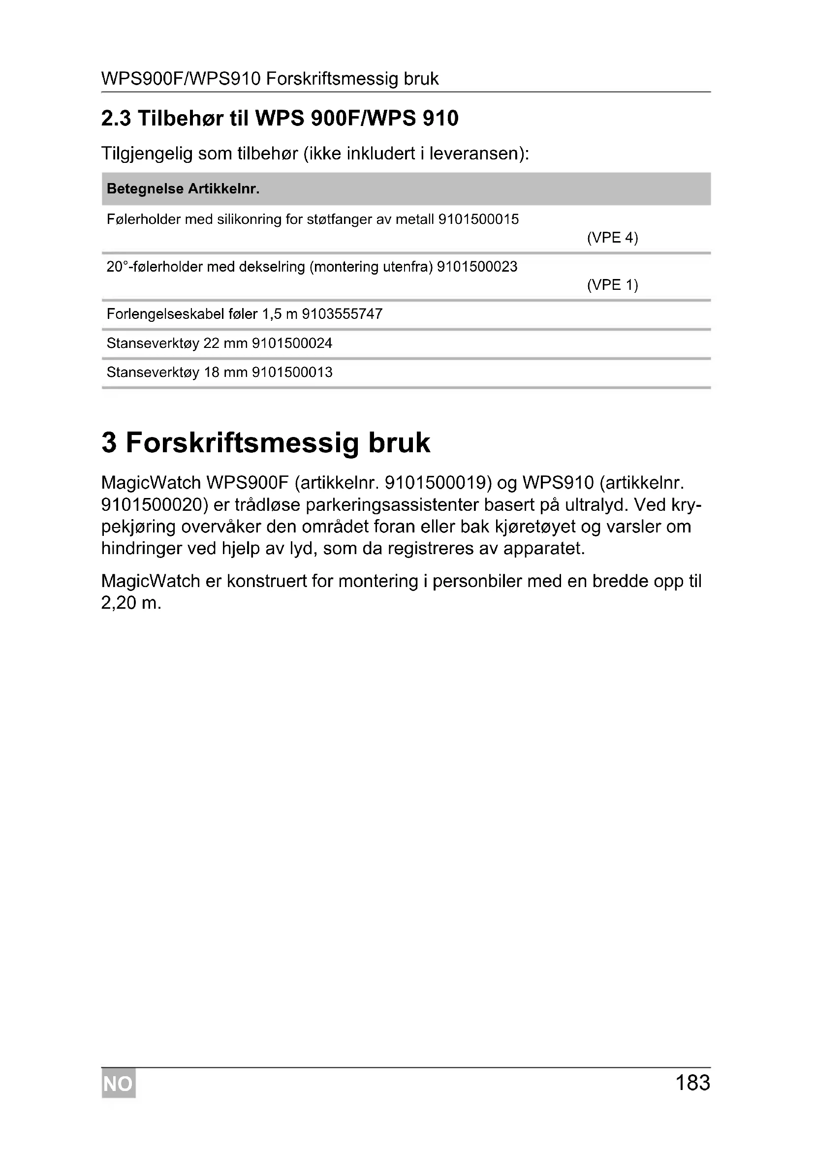 Tilgjengelig som tilbehør (ikke inkludert i leveransen): 3 Forskriftsmessig bruk MagicWatch WPS900F (artikkelnr. 9101500019) og WPS910 (artikkelnr. 9101500020) er trådløse parkeringsassistenter basert på ultralyd. Ved kry- pekjøring overvåker den området foran eller bak kjøretøyet og varsler om hindringer ved hjelp av lyd, som da registreres av apparatet. MagicWatch er konstruert for montering i personbiler med en bredde opp til 2,20 m. Betegnelse Artikkelnr. Følerholder med silikonring for støtfanger av metall 9101500015 (VPE 4) 20°-følerholder med dekselring (montering utenfra) 9101500023 (VPE 1) Forlengelseskabel føler 1,5 m 9103555747 Stanseverktøy 22 mm 9101500024 Stanseverktøy 18 mm 9101500013NO Råd før montering WPS900F/WPS910