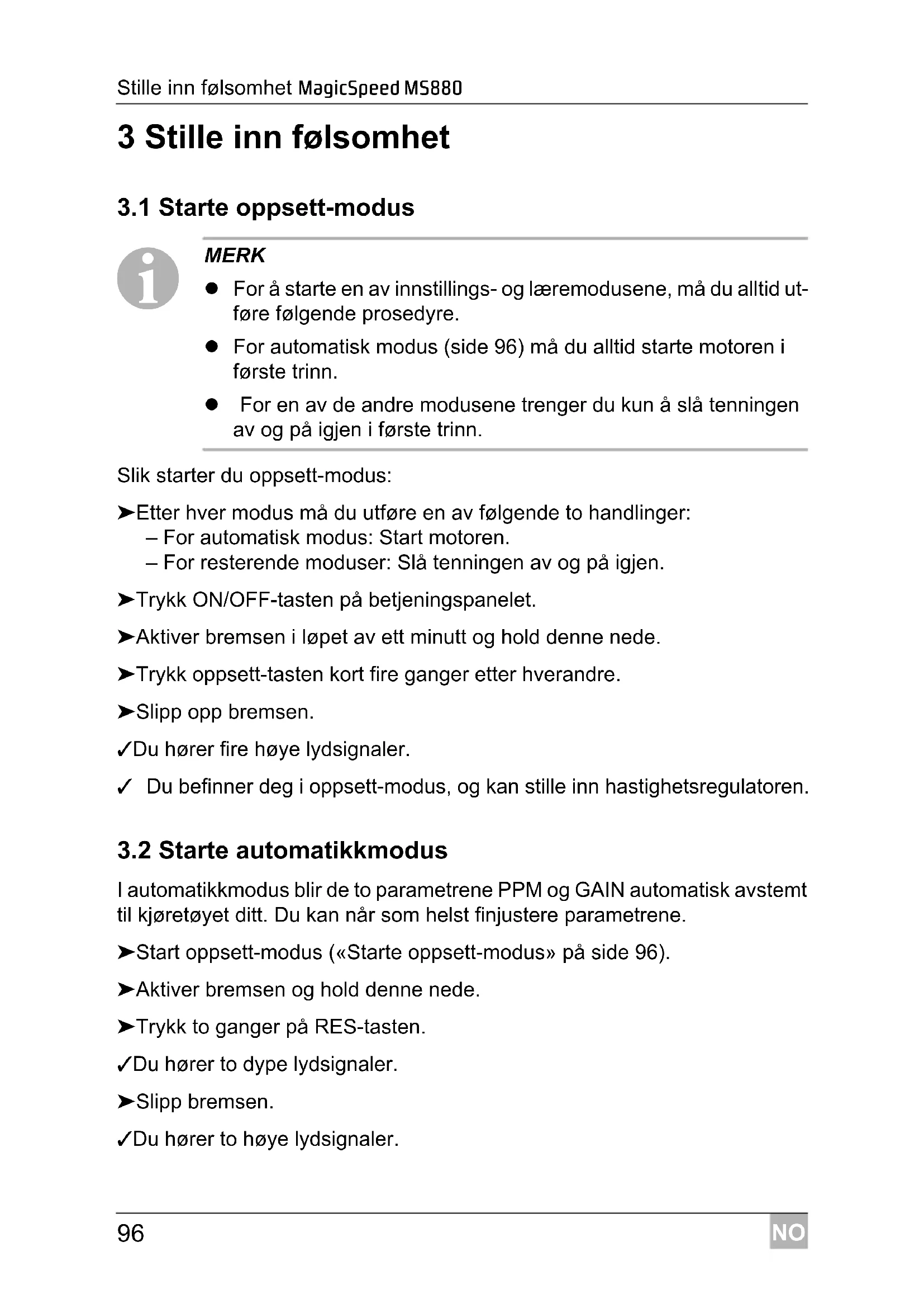 MERK Hvis du hører mer enn to lydsignal, gjentar du prosessen. ➤ Kjør kjøretøyet med en hastighet på 70 km/t, slik at parametrene PPM og GAIN kan stilles inn automatisk. ➤ Trykk på SET-tasten. ✓ Hastighetsregulatoren slås på. Hvis hastighetsregulatoren ikke overfører hastigheten mykt eller hvis den la- grede verdien ikke overføres: ➤ Trykk på tasten SET for å øke verdien, eller ➤ ... trykk på tasten RES for å redusere verdien. ✓ Du hører et lydsignal for hvert tastetrykk. Den aktuelle verdien vises via antall lyder (3 – 14 lyder). I fabrikkinnstilling høres 5 lyder. ➤ Aktiver bremsen for å lagre de innstilte verdiene (PPM og GAIN). ✓ Normalt er systemet nå optimalt innstilt for kjøretøyet ditt. ➤ Avslutt oppsett-modus («Avslutte oppsett-modus» på side 100). ➤ Nå kan du bruke MagicSpeed MS880.