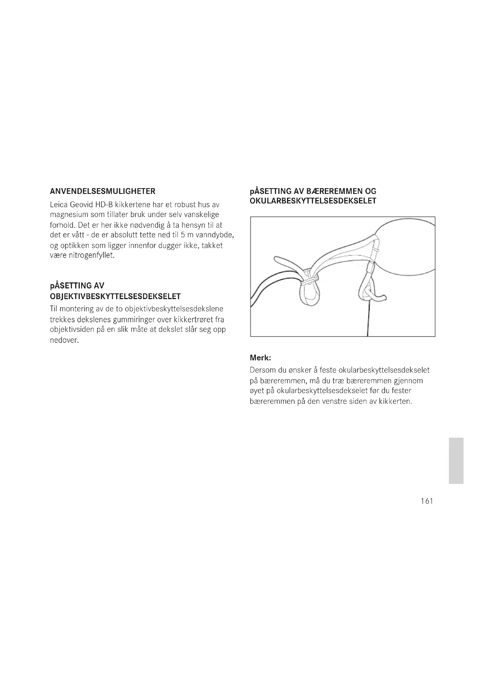 LEVERT UTSTYR – Kikkert – 1 Litium knappcelle 3V type CR 2 – Bærerem – Beredskapsveske – Okularbeskyttelsesdeksel – 2 Objektivbeskyttelsesdeksel – MicroSD-minnekort 2GB – MicroSD kortadapter – Garantikort – Pinsett – Testsertifikat Advarsel Som for alle kikkerter må man unngå å se direkte inn i skarpe lyskilder med din Leica Geovid HD-B, for å unngå skade på øynene.159 FORORD Kjære kunde, Over hele verden står navnet Leica for høyeste kvalitet, finmekanisk presisjon sammen med høyeste grad av pålitelighet og en lang brukstid. Vi ønsker deg glede og lykke til med din nye LEICA Geovid HD-B. Denne kikkerten med integrert avstandsmåler sender ut usynlige og for øyet uskadelige infrarød-impulser og beregner objektets avstand på basis av den reflekterte signalandelen via en innebygd mikroprosessor. Utover dette registrerer den omgivelses- og bruksforholdene. Samme med disse og de målte avstandene kan den for forskjellige valgbare og fritt programmerbare ballistikkurver beregne og vise tilsvarende korreksjoner av holdepunktet, de respektive klikk-justeringene av siktet på et kikkertsikte eller de ekvivalente horisontale avstandene. For at du skal kunne utnytte alle de mulighetene dette hoykvalitets og allsidige instrumentet har å by på på en riktig måte, anbefaler vi at du først leser denne veiledningen.