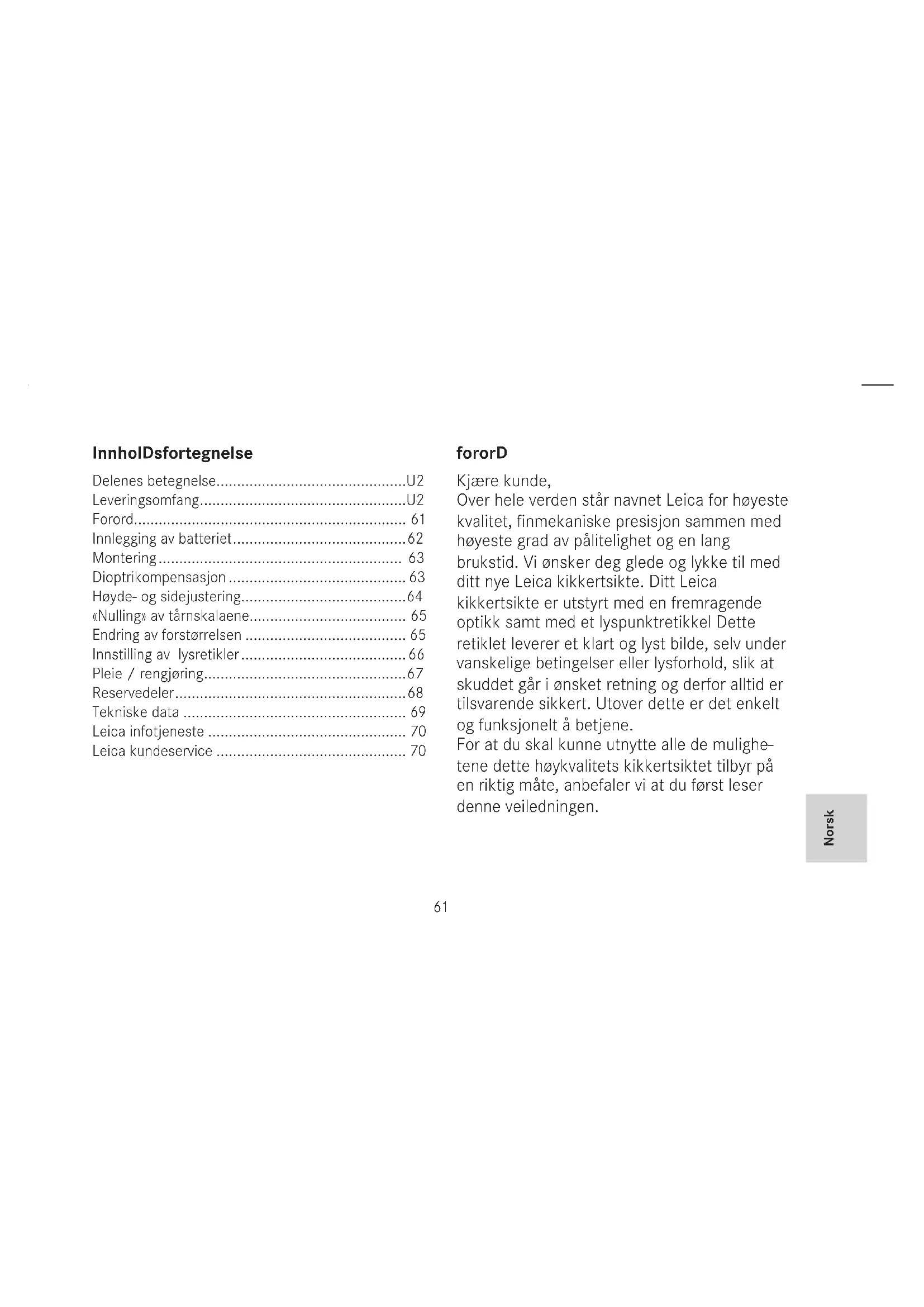 - Lagre ditt kikkertsikte på et godt luftet, tørt og kjølig sted, særlig for å unngå angrep av sopp i fuktige klimatiske omgivelser. reserveDeler Dersom du noen gang skulle trenge reservedeler til ditt Leica kikkertsikte, som eksempelvis skrulokk, tetninger eller beskyttelseskapper, så henvend deg til vår kundeservice (adresse se side 70) eller til din nasjonale Leica representant (se Garantikortet når det gjelder adresser).Norsk