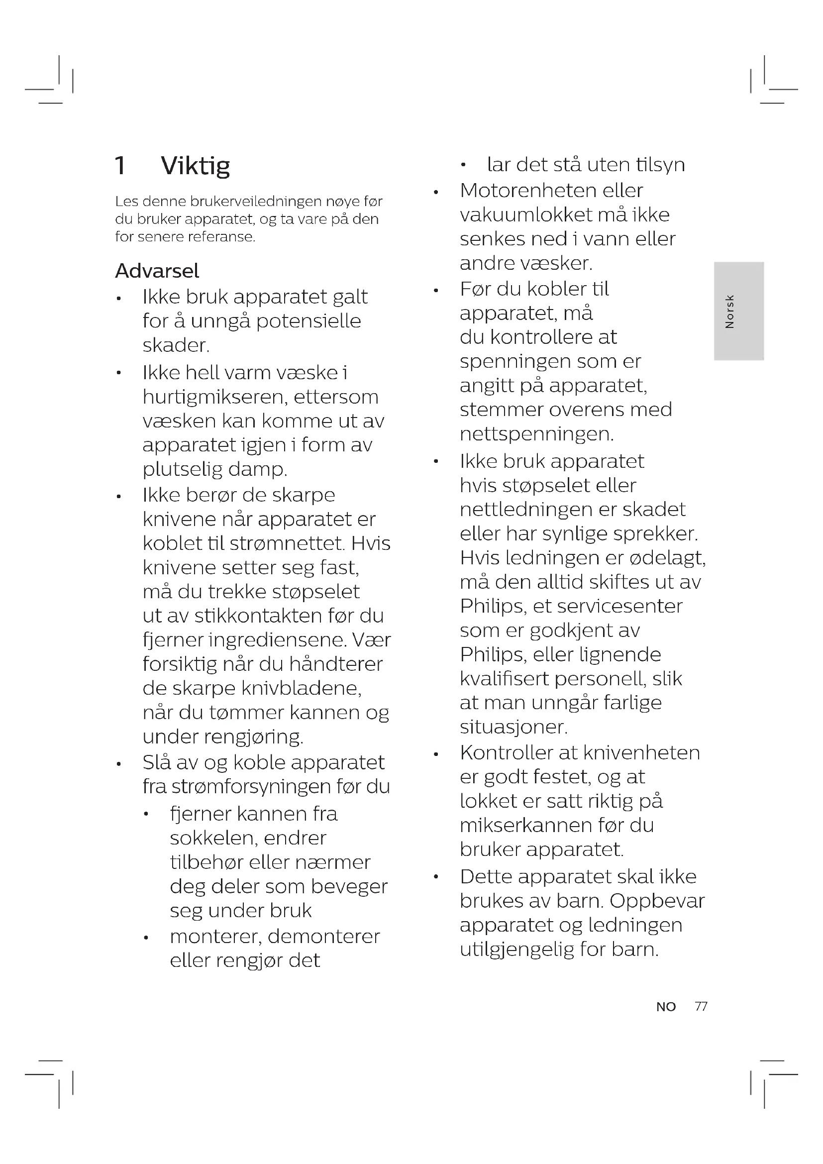 Dette apparatet skal ikke brukes av barn. Oppbevar apparatet og ledningen utilgjengelig for barn. 1 Viktig Les denne brukerveiledningen nøye før du bruker apparatet, og ta vare på den for senere referanse. Advarsel