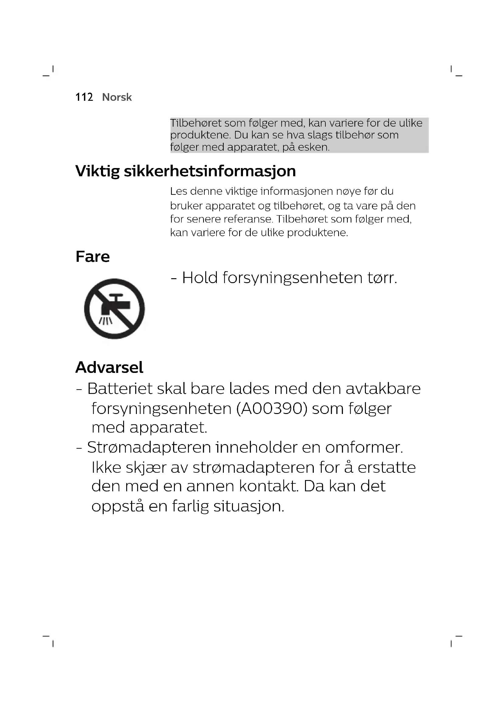 NorskTilbehøret som følger med, kan variere for de ulike produktene. Du kan se hva slags tilbehør som følger med apparatet, på esken. Viktig sikkerhetsinformasjon Les denne viktige informasjonen nøye før du bruker apparatet og tilbehøret, og ta vare på den for senere referanse. Tilbehøret som følger med, kan variere for de ulike produktene. Fare - Hold forsyningsenheten tørr. Advarsel - Batteriet skal bare lades med den avtakbare forsyningsenheten (A00390) som følger med apparatet. - Strømadapteren inneholder en omformer. Ikke skjær av strømadapteren for å erstatte den med en annen kontakt. Da kan det oppstå en farlig situasjon.